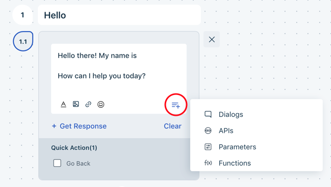 Você pode acessar espaços reservados (incluindo APIs, parâmetros, funções e outras caixas de diálogo) clicando no ícone inferior direito. Se você não encontrar um espaço reservado adequado, poderá criar uma nova API, parâmetro ou função aqui.