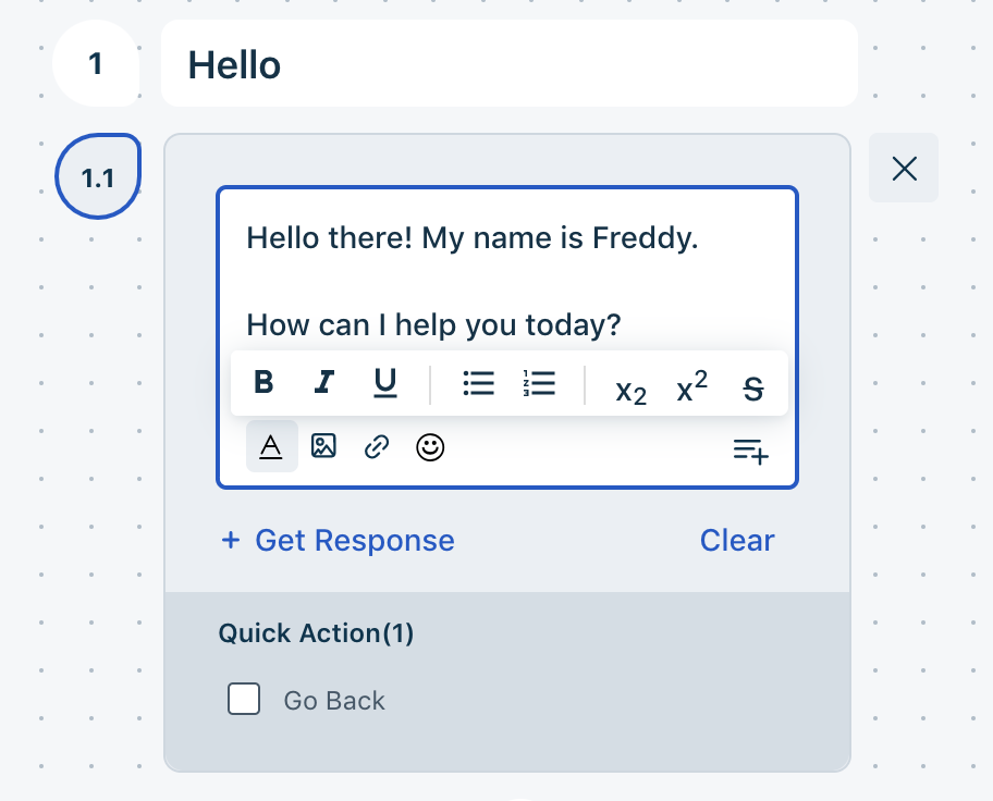 Ao mostrar uma mensagem para seus clientes, você pode usar texto, imagens, hiperlinks e emojis. Você também pode optar por formatar o texto que usa. Você pode usar os atalhos padrão para formatação ou usá-los no menu. Oferecemos suporte a negrito, itálico, sublinhado, marcadores de lista não ordenados, marcadores de lista ordenados, subscrito, sobrescrito e tachado.