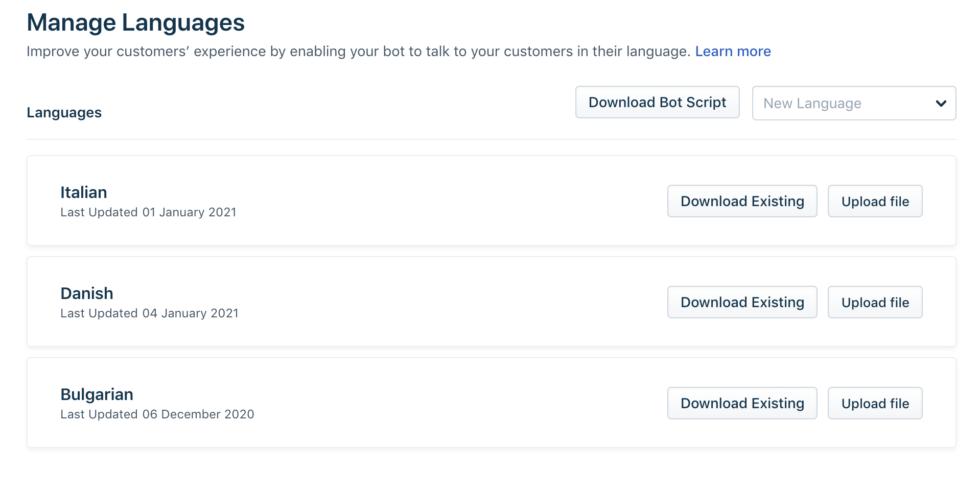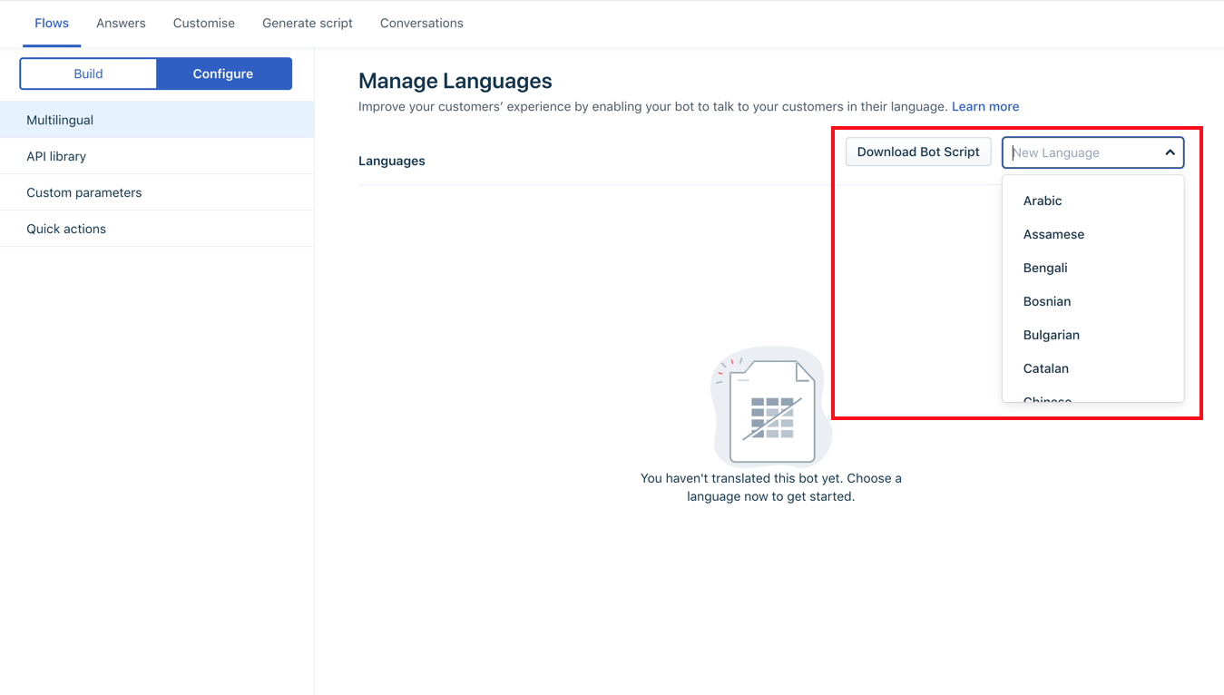 Quando você tem uma base de clientes global, um bot conversando com seus clientes em um idioma que eles entendam melhor melhorará seu suporte ao cliente e a classificação CSAT. Com o construtor de bot, você pode configurar vários idiomas em um único painel, tornando seu bot poliglota. Se uma conversa específica precisar ser atualizada para outro idioma, você poderá acessá-la no construtor de bot e atualizar a conversa apenas para esse idioma.