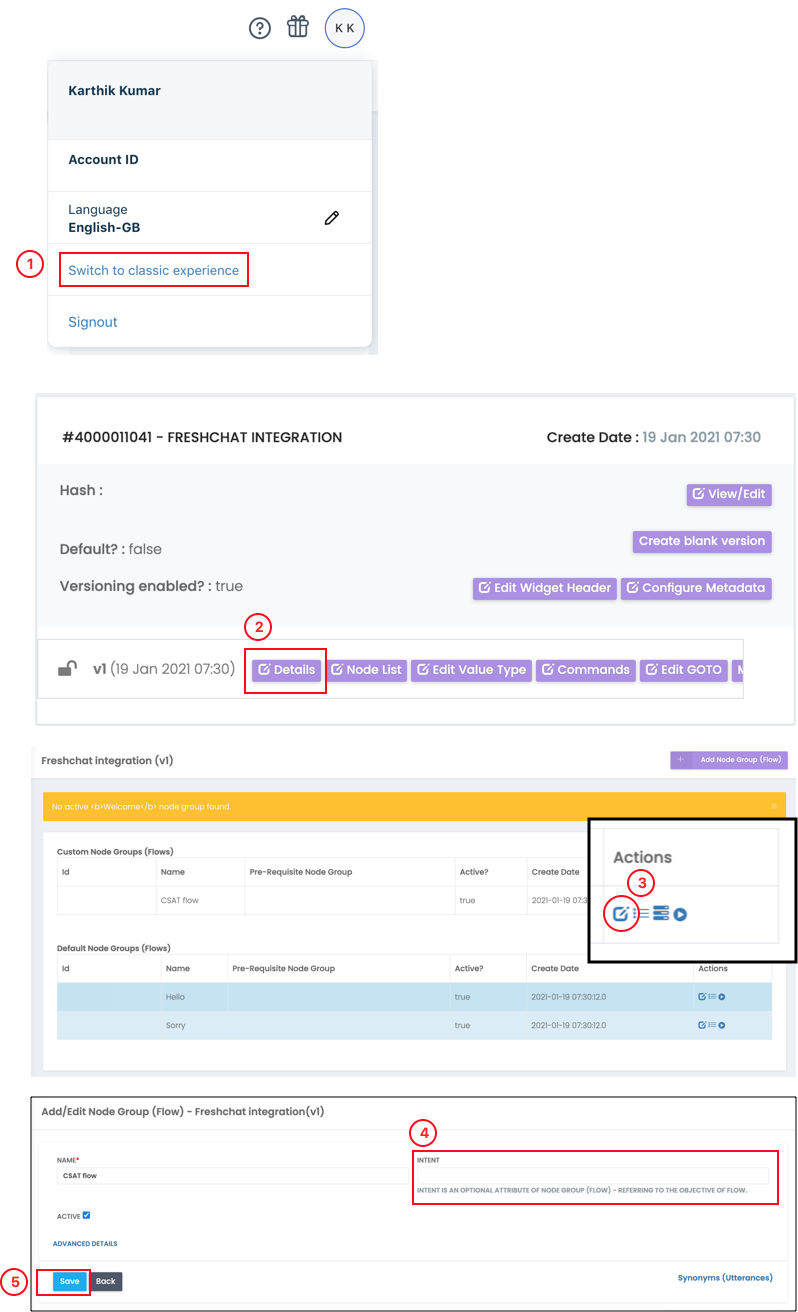 - Para configurar a intenção do grupo de nós, primeiro preencha um nome no campo de intenção do grupo de nós . Navegue até o ícone do seu perfil (canto superior direito) > (1) Alternar para a experiência clássica > Identifique o bot e a versão em que você tem o fluxo configurado > (2) Detalhes > (3) Exibir/editar > insira o valor para (4 ) intenção do grupo de nós e certifique-se de que corresponda ao que você inseriu na página de integração do Freshchat no campo de intenção do grupo de nós > (5) Salvar. Lembre-se de voltar para a experiência mint no canto superior direito para continuar configurando as outras opções.