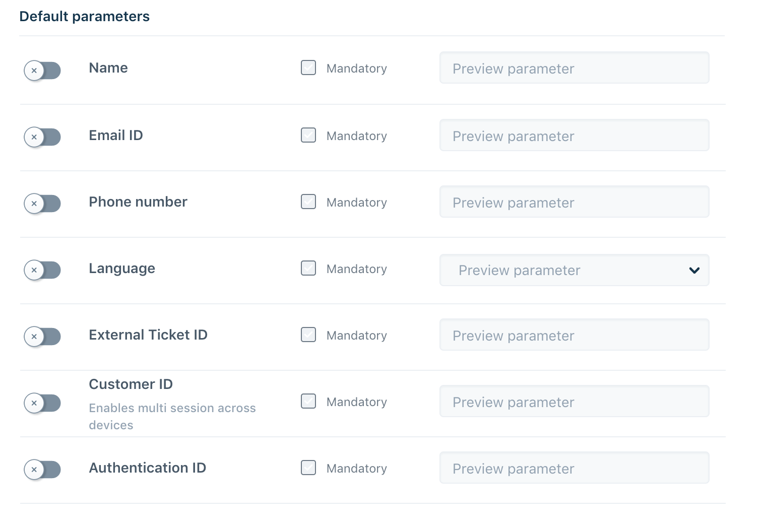 Você pode optar por ativar qualquer um dos parâmetros que deseja incluir no script do bot. Isso incluirá o código para os parâmetros no script do widget do bot. Você pode optar por preencher previamente esses parâmetros com os espaços reservados que você usa em seu portal de suporte, site, aplicativos móveis.