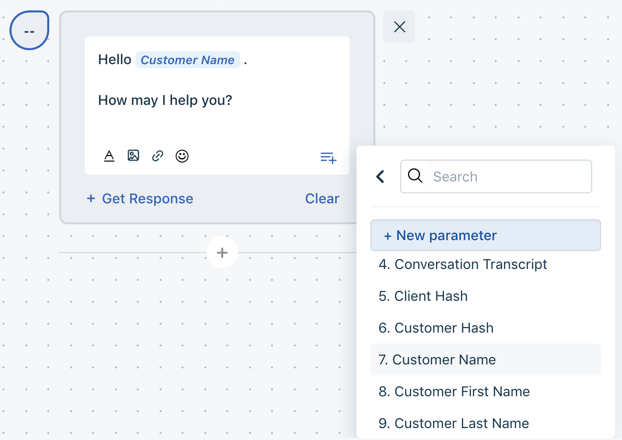 - No fluxo do chatbot, selecione a caixa de diálogo onde deseja usar o parâmetro padrão. Clique em Nova mensagem > Clique em + > e escolha Parâmetro na lista de espaços reservados.