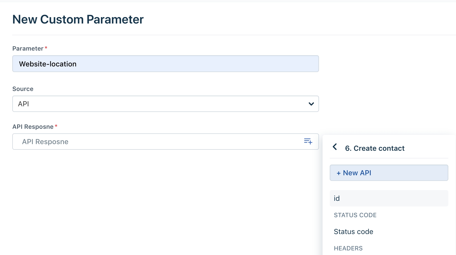 Observação: se o parâmetro personalizado do Source JS estiver marcado como obrigatório, certifique-se de que o valor esteja disponível e seja obtido no site para a variável definida - o bot não será carregado caso contrário.- API: se a origem for selecionada como API, você poderá selecionar os parâmetros de resposta necessários de uma API da biblioteca de API desse bot para inicializar o parâmetro personalizado. Depois que essa API é chamada em um fluxo, o parâmetro customizado assume o valor dos parâmetros de resposta mapeados para ele.