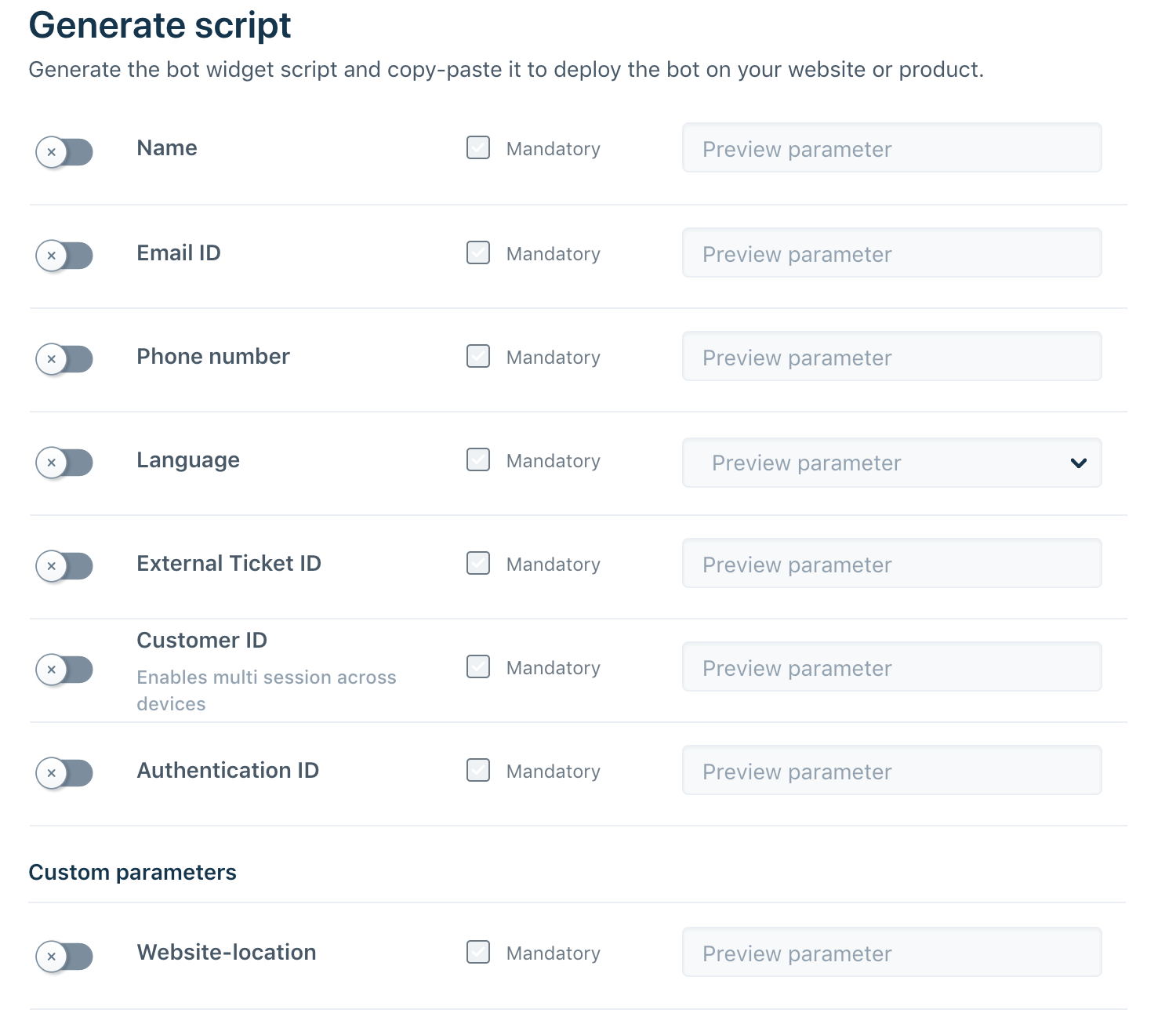 Observação: se os valores não forem passados para parâmetros obrigatórios, o widget do bot não será carregado. Para evitar isso, você pode preencher previamente um valor padrão para parâmetros obrigatórios na página Gerar script