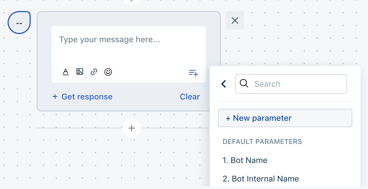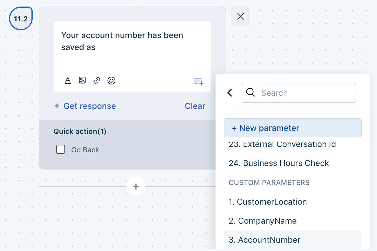 - Para usar a propriedade customizada de nível de conversa que você criou, clique no sinal + para acessar seus espaços reservados > Parâmetros > Informações Extras da Conversa > Insira a chave de atributo que você inseriu ao declarar o atributo. Observe que a variável diferencia maiúsculas de minúsculas.