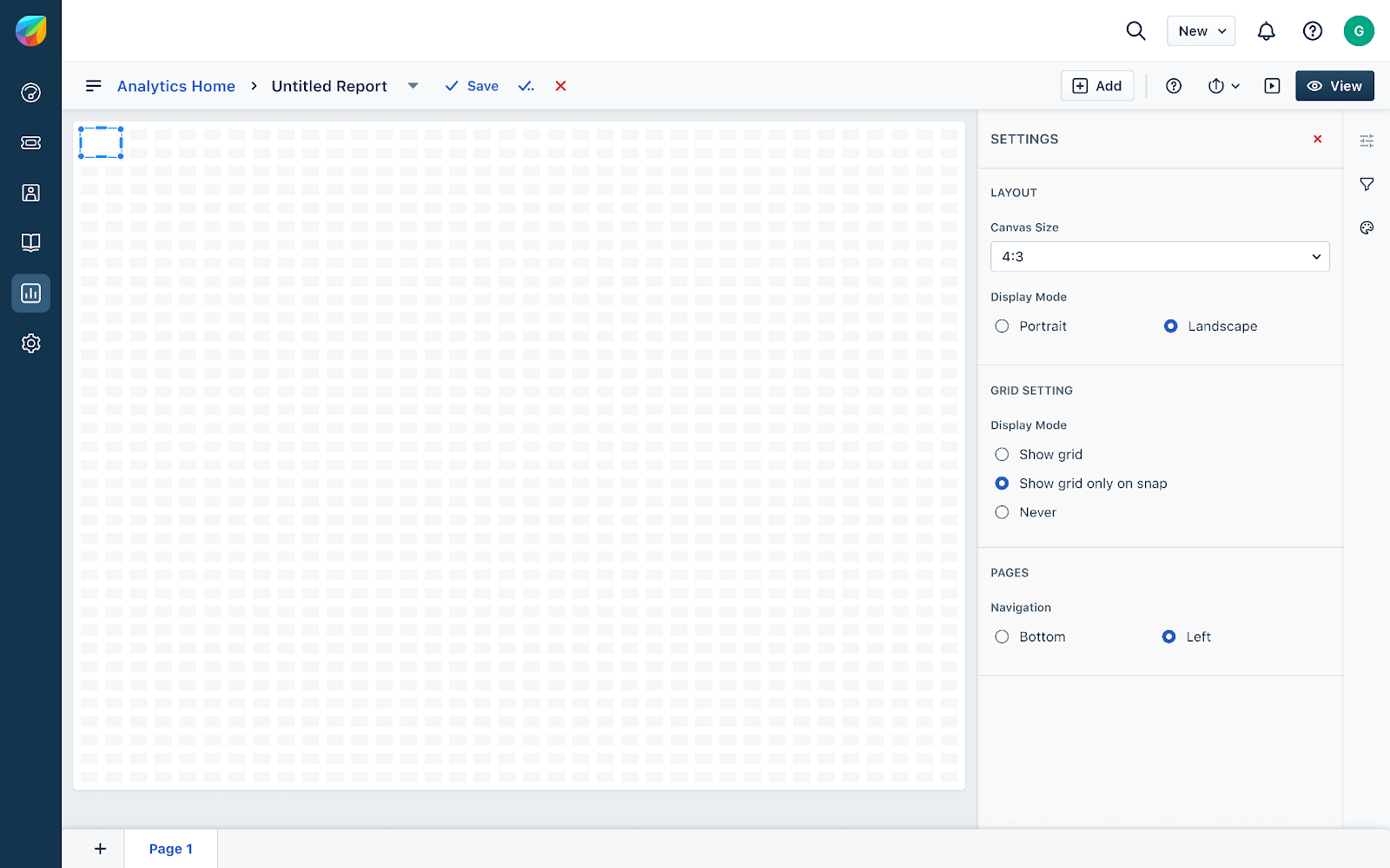 Você pode começar a criar um relatório clicando no botão 'Novo relatório'. Em vez de nomear o relatório logo no início, você pode nomeá-lo conforme sua conveniência, usando o campo de nome editável na barra de navegação superior esquerda.
