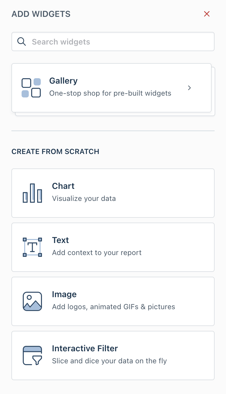 Com a nova experiência, você pode adicionar facilmente um novo widget do painel Widget na Galeria ou criar um do zero. A Galeria oferece opções para widgets populares, modelos e até mesmo uma galeria personalizada