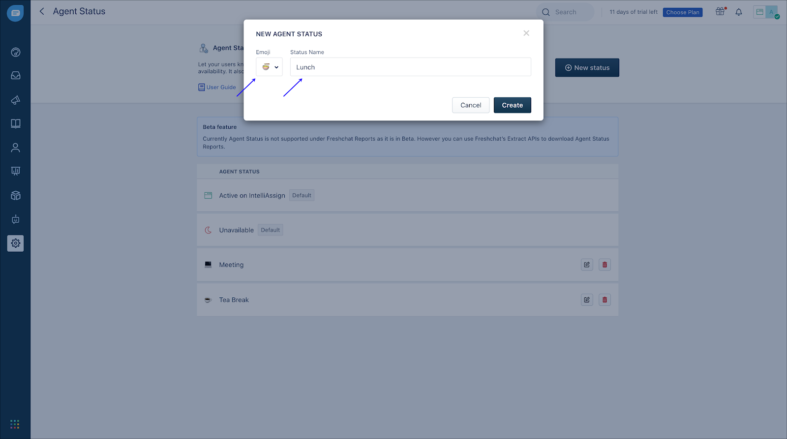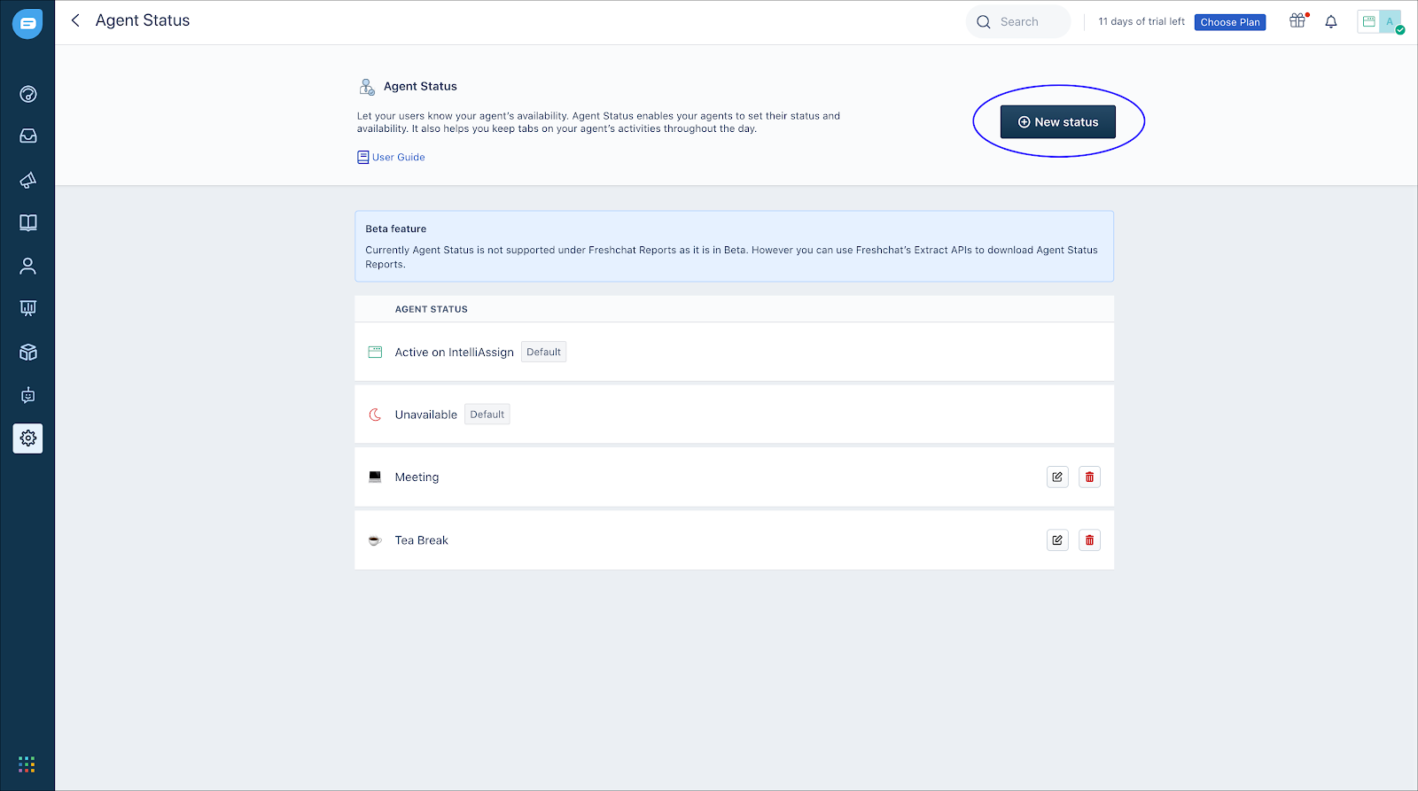 Se você for um administrador no Freshchat, poderá criar status personalizados para seus agentes usando o recurso Status do agente.
