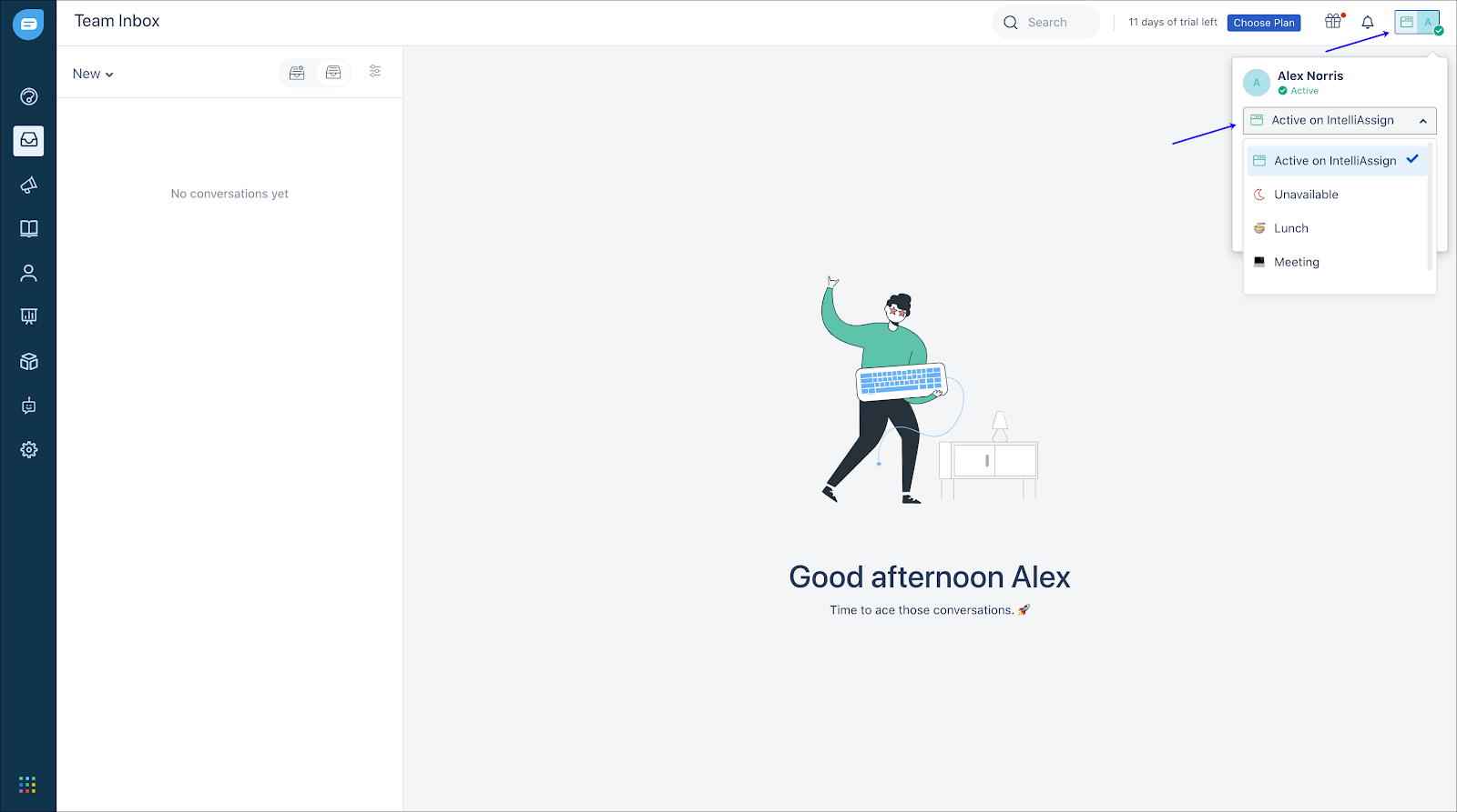 - Os agentes podem atualizar seu status clicando em seu perfil no canto superior direito da tela e selecionando o respectivo status no menu suspenso.