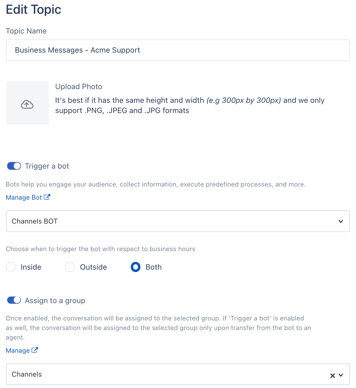 - Você pode editar o tópico, optar por acionar um bot para responder a perguntas ou atribuí-lo a um grupo para interação direta com o agente.