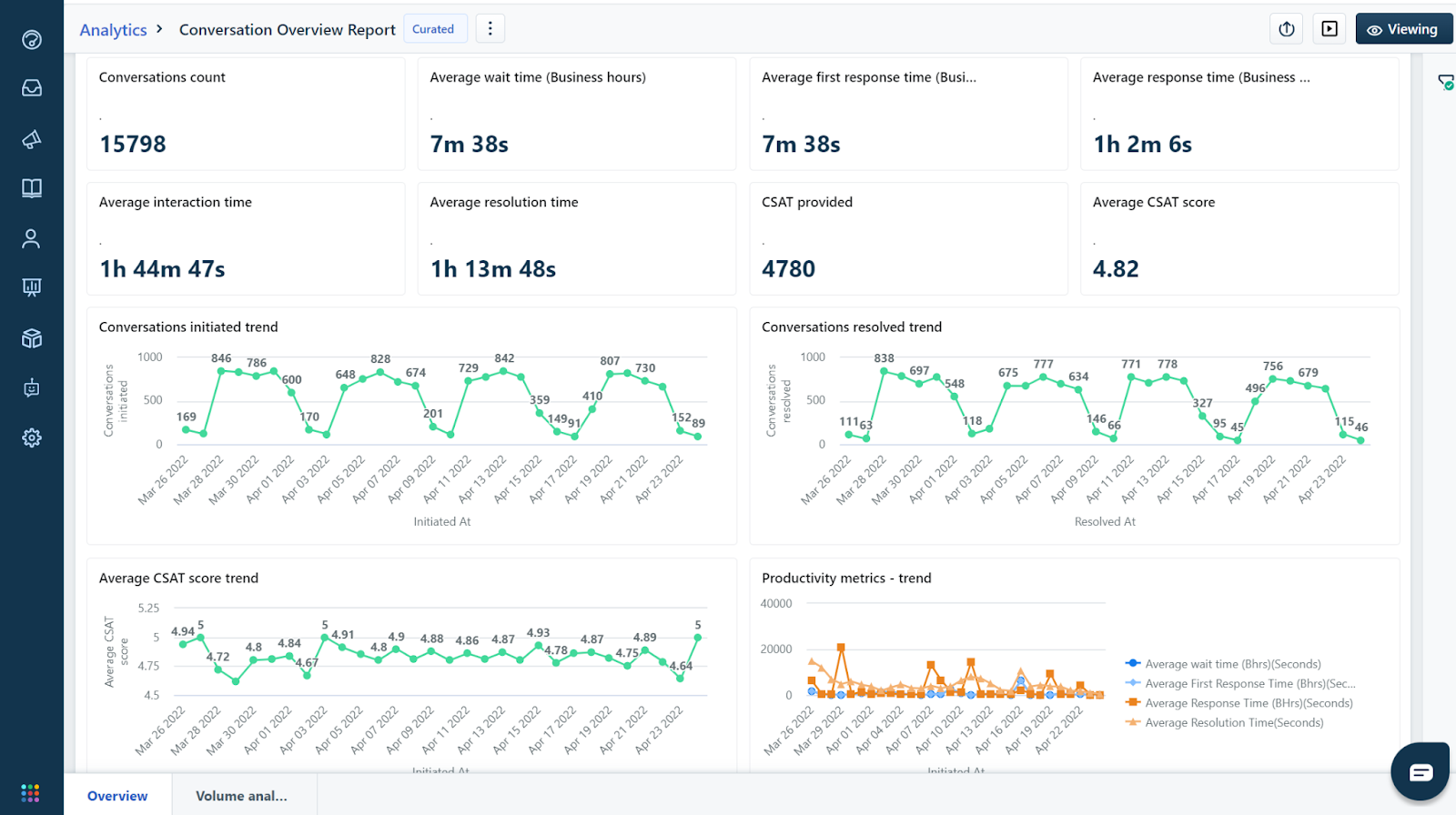Relatórios de visão geral da conversa Com esse relatório, você pode acompanhar o volume do chat e a produtividade do agente. Você pode analisar o quão bem sua equipe está gerenciando o volume do chat e o volume das consultas que chegam em diferentes horas do dia para gerenciar turnos e recursos. Você também pode ver a rapidez com que seus agentes enviam a primeira resposta e resolvem as conversas.