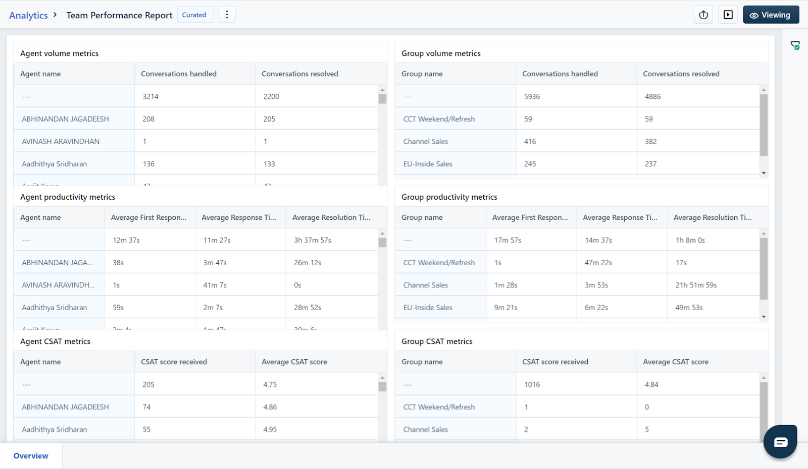 Relatório de desempenho da equipe Com esse relatório, você pode acompanhar o número total de conversas nas quais seus agentes participaram e o número geral de mensagens enviadas por cada agente da equipe. Você também pode obter informações sobre o número total de pesquisas enviadas em nome de cada agente, uma contagem de suas avaliações satisfatórias e insatisfatórias e sua pontuação média de CSAT. Este relatório está disponível apenas no plano Growth e acima.