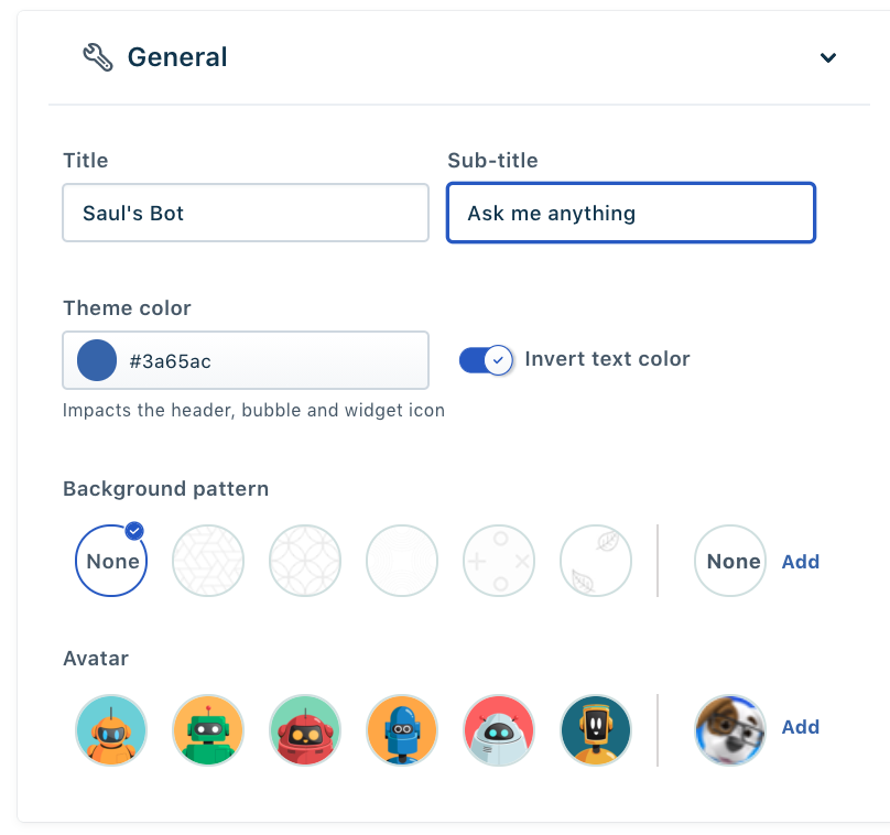 - Escolha um padrão de plano de fundo e configure um ícone de avatar para seu bot. O tamanho recomendado do avatar do bot é 25x25px