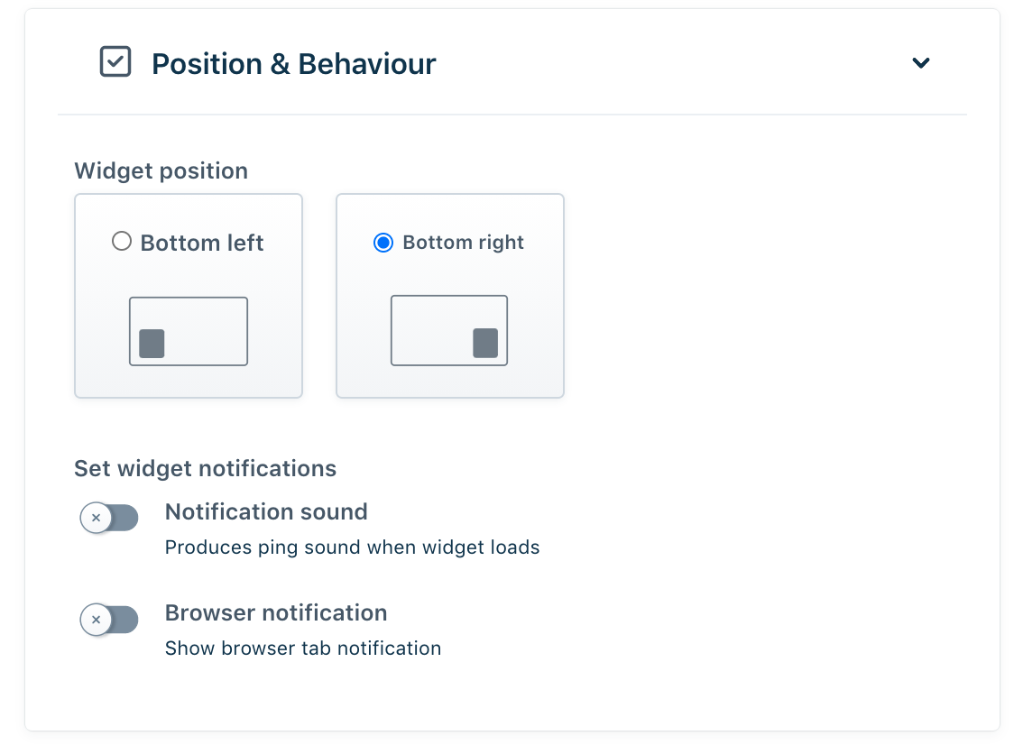 - Definir notificações do widget : você pode optar por alternar um som de notificação e uma notificação do navegador sempre que houver uma resposta/atualização no bot