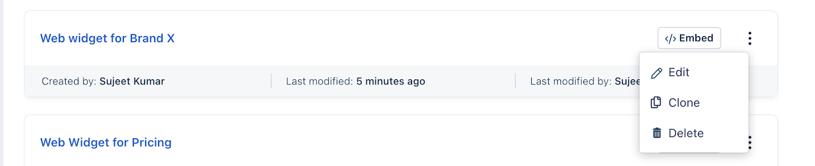 Você pode optar por clonar ou excluir um widget clicando no botão 'opções' ao lado de cada widget.