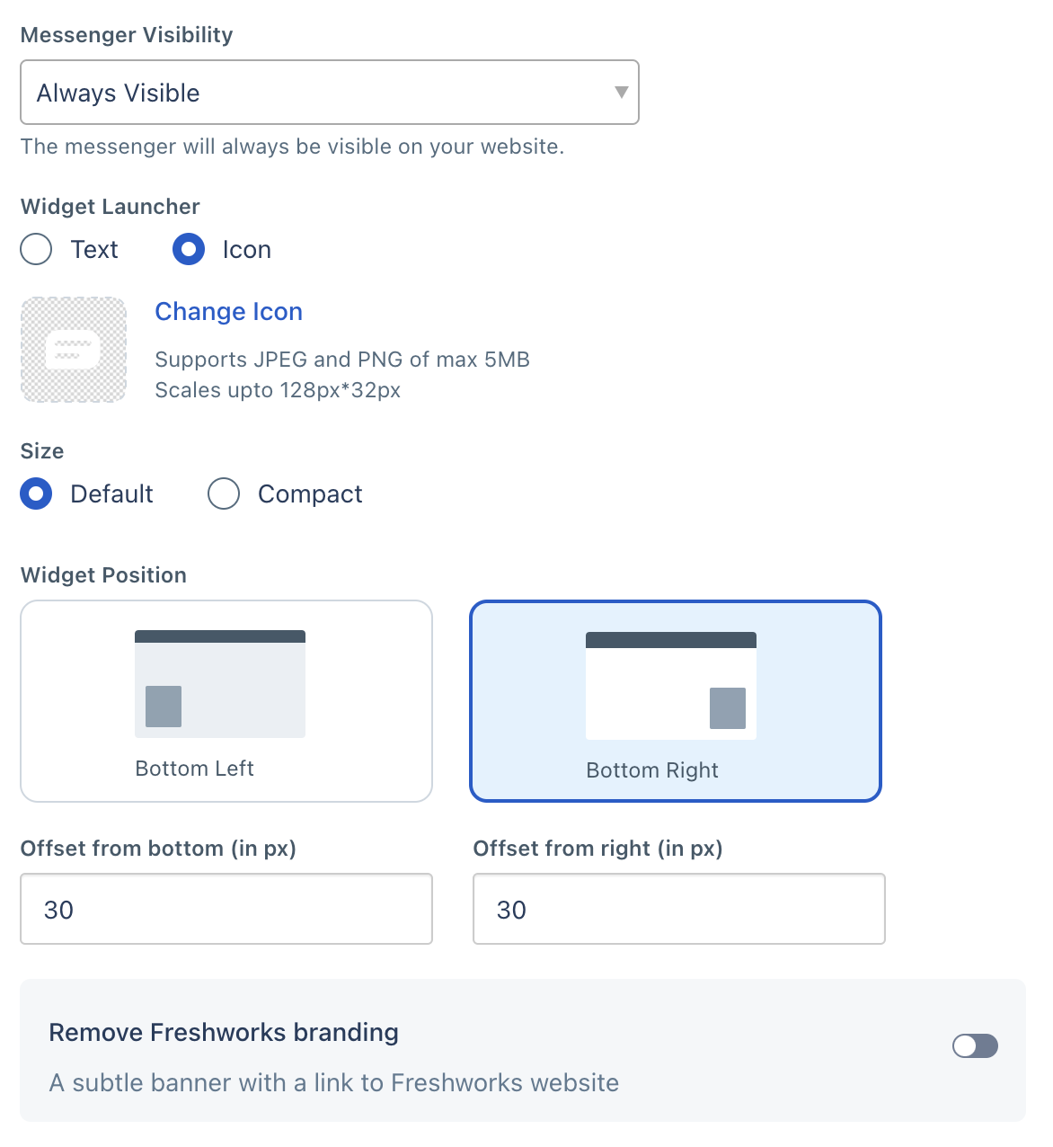 - Visibilidade do Messenger: Com a opção Visibilidade do Messenger, você pode torná-lo visível, oculto ou apenas visível durante o horário de trabalho (Horário comercial padrão). Você pode ver uma prévia de todas as suas configurações à direita.