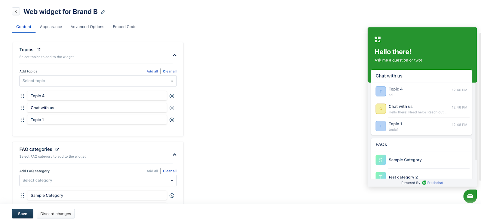 Depois de criar um widget / escolher o widget padrão, agora você pode optar por configurar o mesmo. O primeiro passo é configurar o conteúdo principal do widget, que inclui tópicos e categorias de perguntas frequentes.