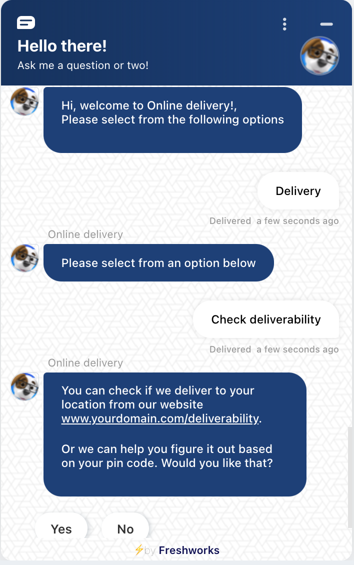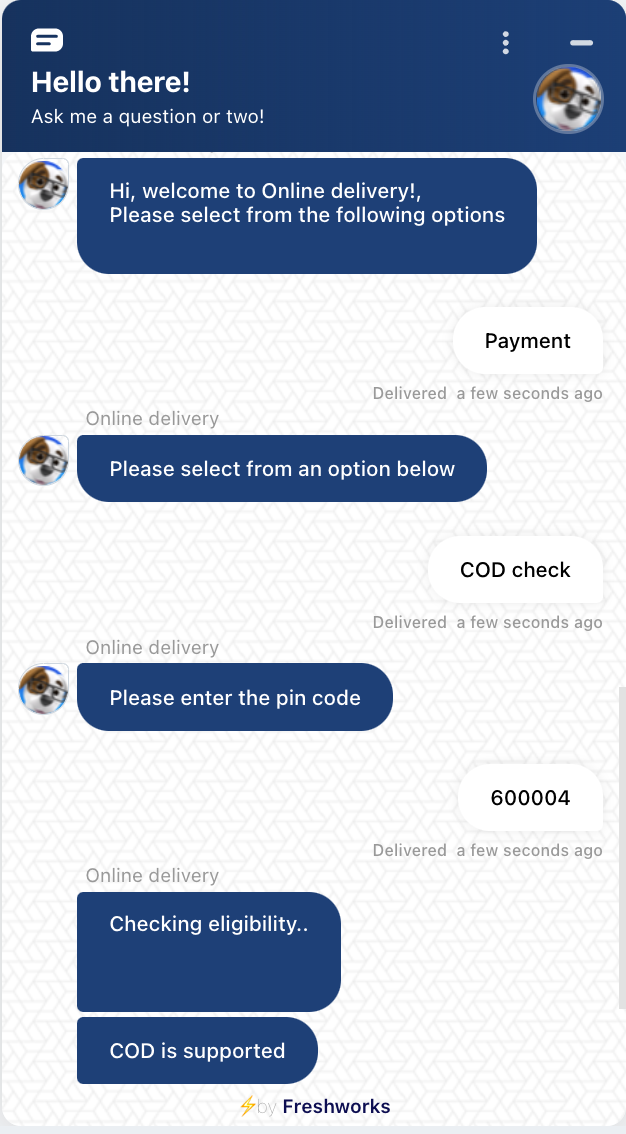 Se você é um serviço de correio ou uma empresa que lida com qualquer tipo de entrega, sua empresa certamente receberá perguntas dos clientes sobre seus pedidos, capacidade de entrega, pagamentos etc. economizando tempo para seus clientes, que agora podem atender a si mesmos e a seus agentes. Neste artigo, veremos como você pode usar este modelo de bot de entrega online para o seu negócio. Dependendo do seu modelo de suporte, você poderá ajustar o modelo de bot - ocultar/mostrar fluxos relevantes, adicionar mais caixas de diálogo dependendo do seu caso de uso, conectar seu bot ao módulo de respostas para lidar com perguntas frequentes e muito mais.