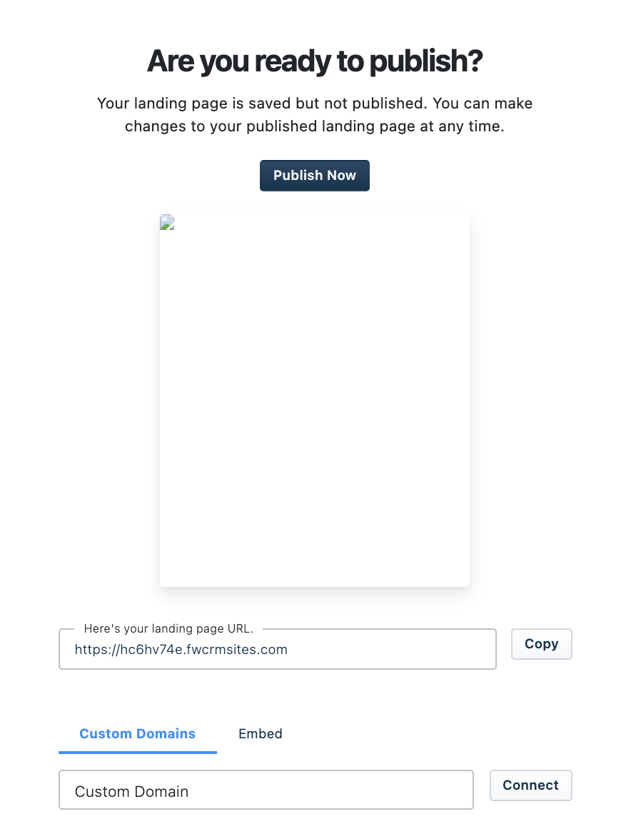 Seu aplicativo da web permite que você mapeie suas páginas para seu site. Uma vez que sua Landing Page foi criada e publicada, você pode compartilhá-la em um e-mail ou em seus perfis sociais. Por padrão, todas as páginas hospedadas pelo Freshworks são publicadas em uma URL que mostra freshworks.net no endereço.