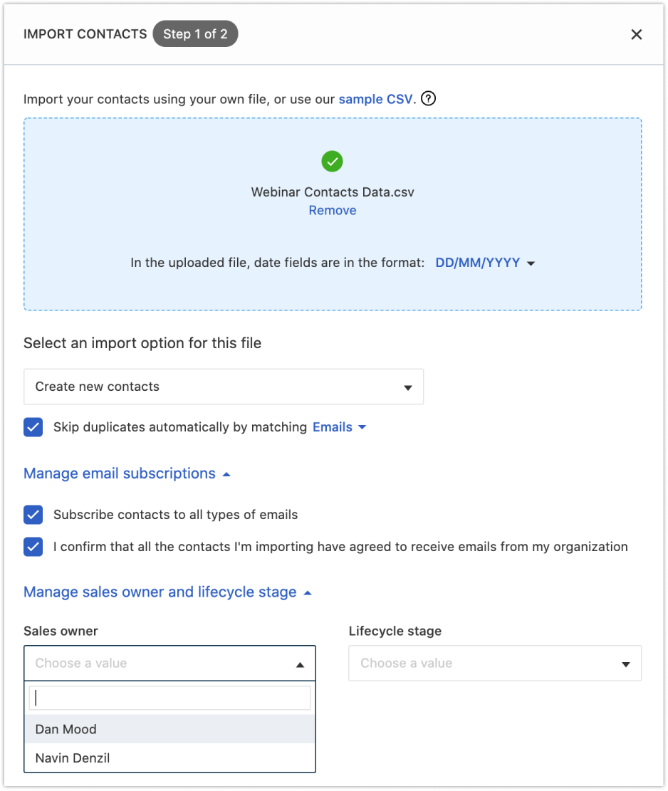 Caso queira mapear proprietários diferentes com registros diferentes, crie uma coluna que contenha os endereços de e-mail dos usuários cadastrados, para que os contatos sejam atribuídos automaticamente aos respectivos usuários. Se quiser mapear todos os contatos para um único proprietário, você tem a opção de selecionar o proprietário durante a importação.