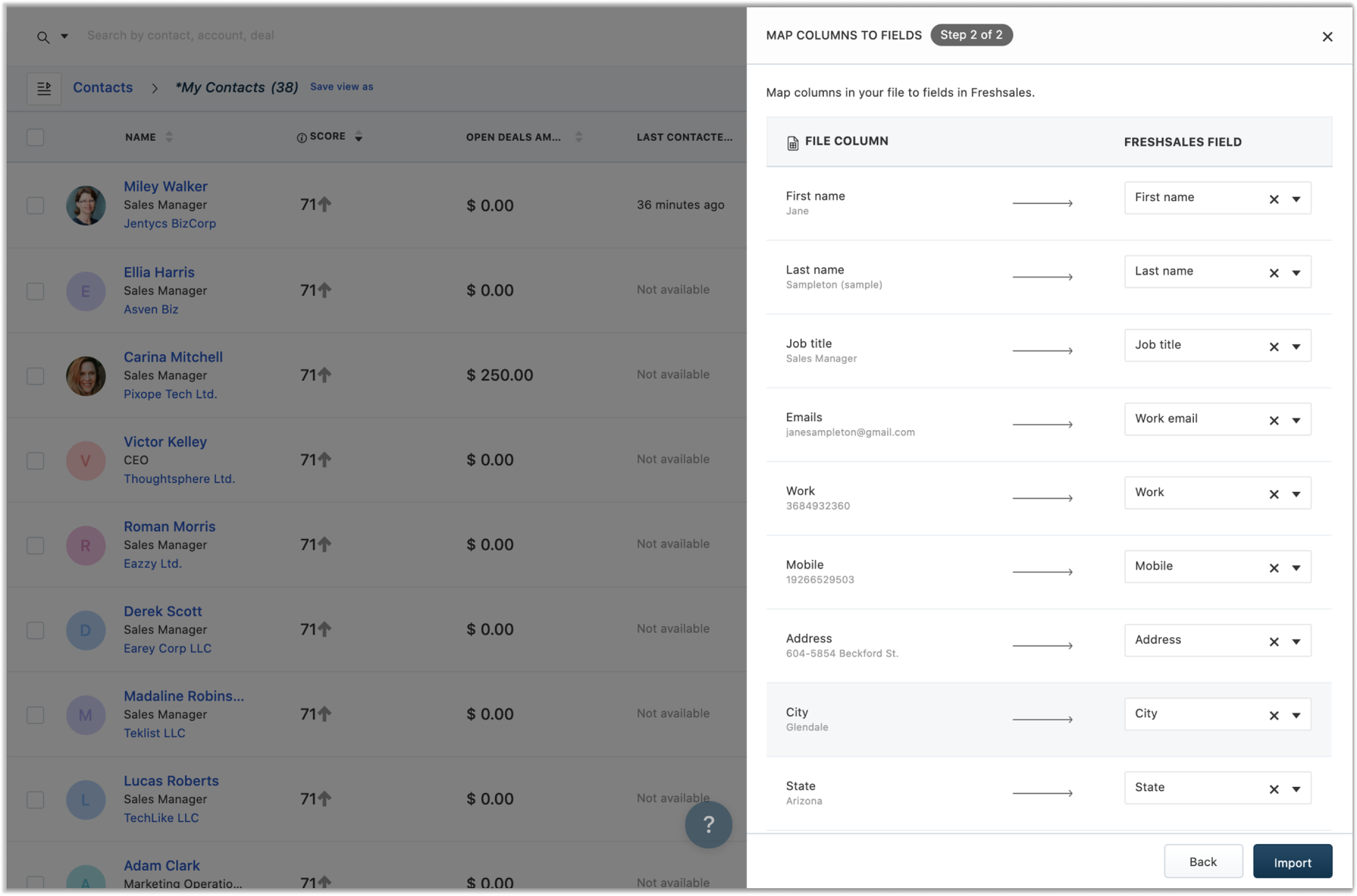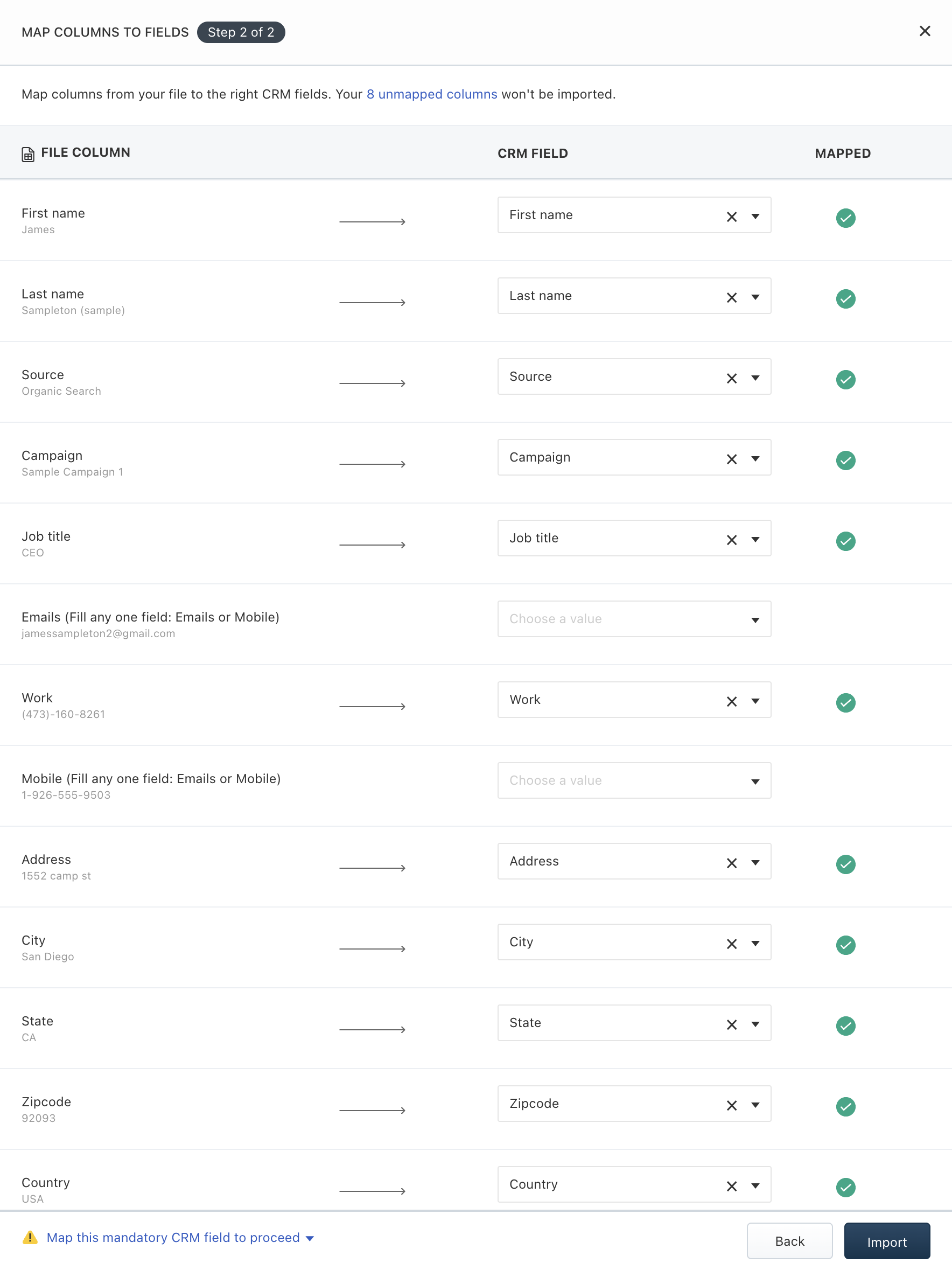 A sobreposição Map Columns to Fields que você vê agora é exclusivamente para mapear as colunas em seu arquivo CSV/XLSX com os campos disponíveis. Os dados de um contato do seu arquivo são exibidos ao lado dos respectivos cabeçalhos para ajudá-lo a mapear melhor os campos.