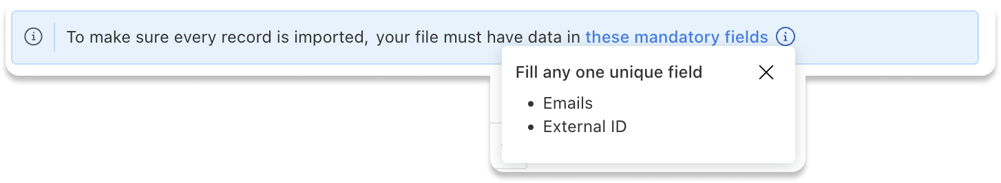 Ao tentar importar um arquivo sem dados nos campos obrigatórios, sua importação não terá sucesso. Preste atenção à lista de campos obrigatórios da sua conta antes de importar o arquivo CSV para garantir que todos os campos obrigatórios sejam preenchidos com valores relevantes.