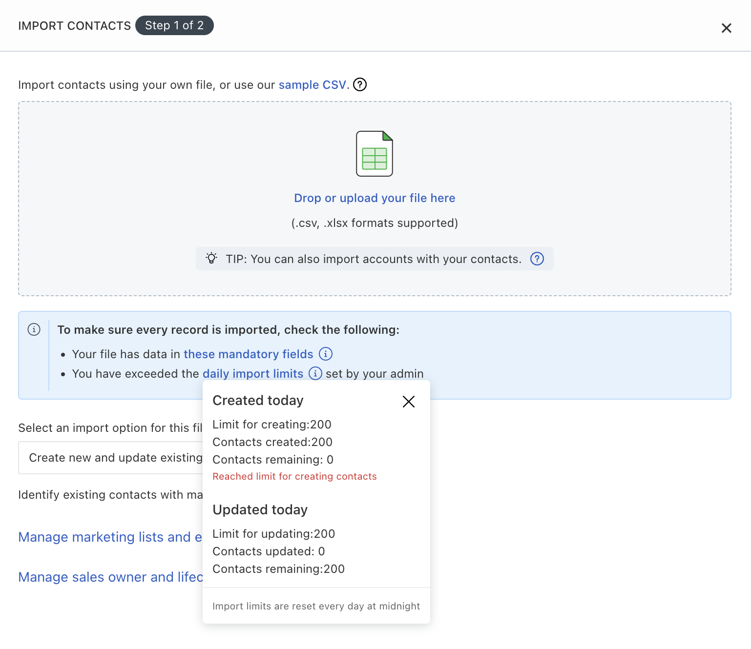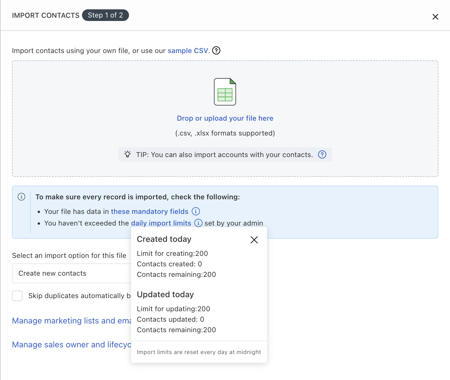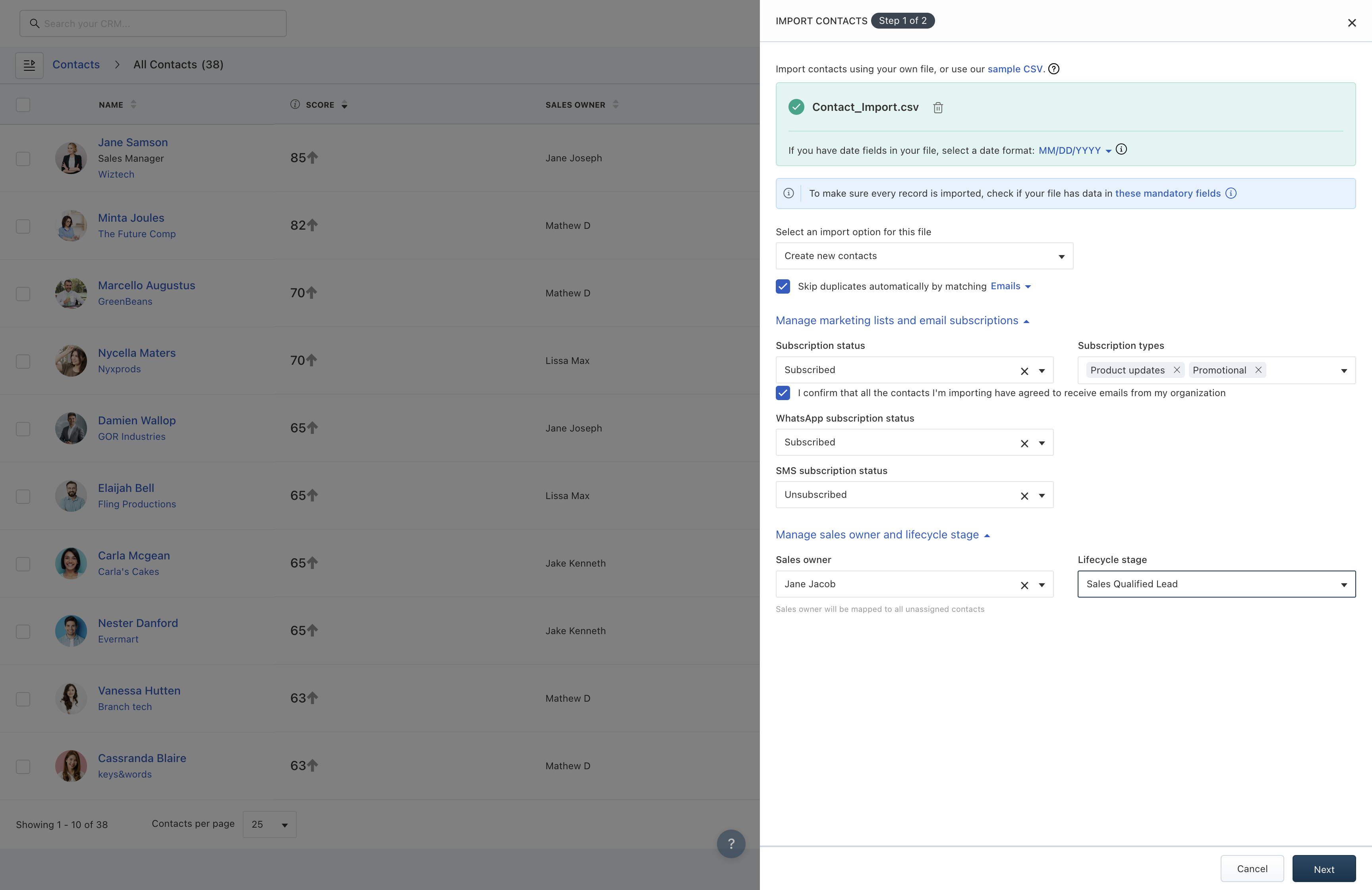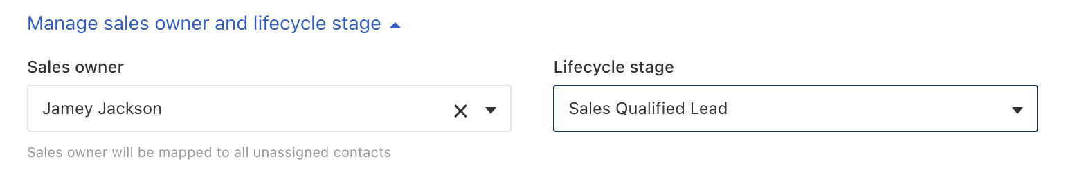- Gerenciar proprietário de vendas e estágio do ciclo de vida: Escolha um usuário que será atribuído como proprietário para todos os registros não atribuídos, ou seja, o campo proprietário é deixado em branco no arquivo CSV/XLSX. Você também pode adicionar o estágio do ciclo de vida para atribuir aos contatos.