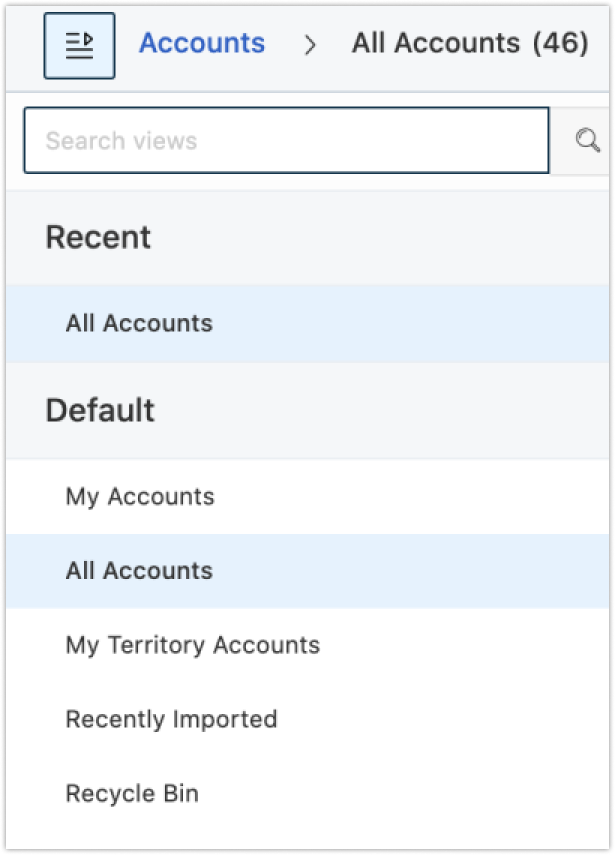 As exibições ajudam a filtrar uma lista de contas com base em determinados critérios. Existem cinco visualizações padrão e, além disso, você pode criar suas próprias visualizações e acessá-las no menu suspenso Visualizações .