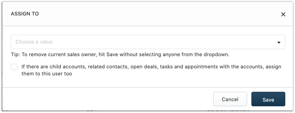 Clique no botão Atribuir a para atribuir várias contas a um proprietário de vendas.