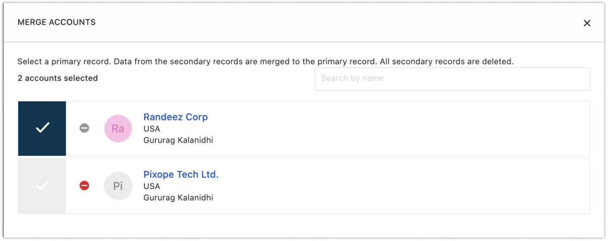 Este botão mescla as contas selecionadas em um único registro. Escolha uma das contas selecionadas como seu registro principal . As outras contas tornam-se registros secundários e são excluídas depois que seus dados são transferidos para o registro principal.