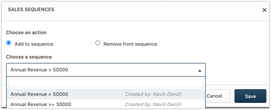 - Adicionar à sequência - Se as contas selecionadas devem ser adicionadas a uma sequência de vendas.