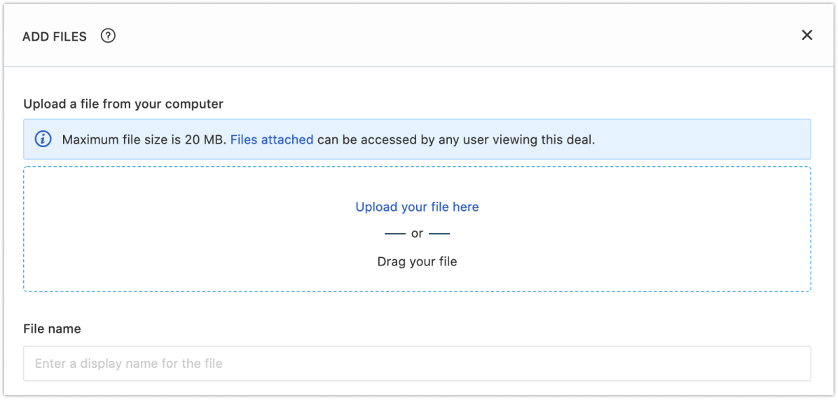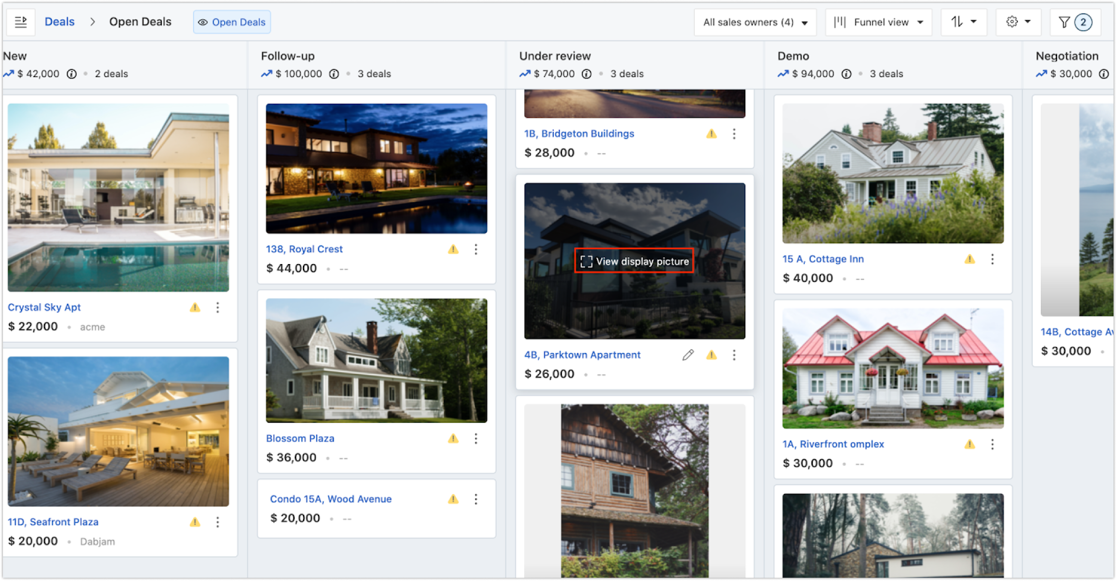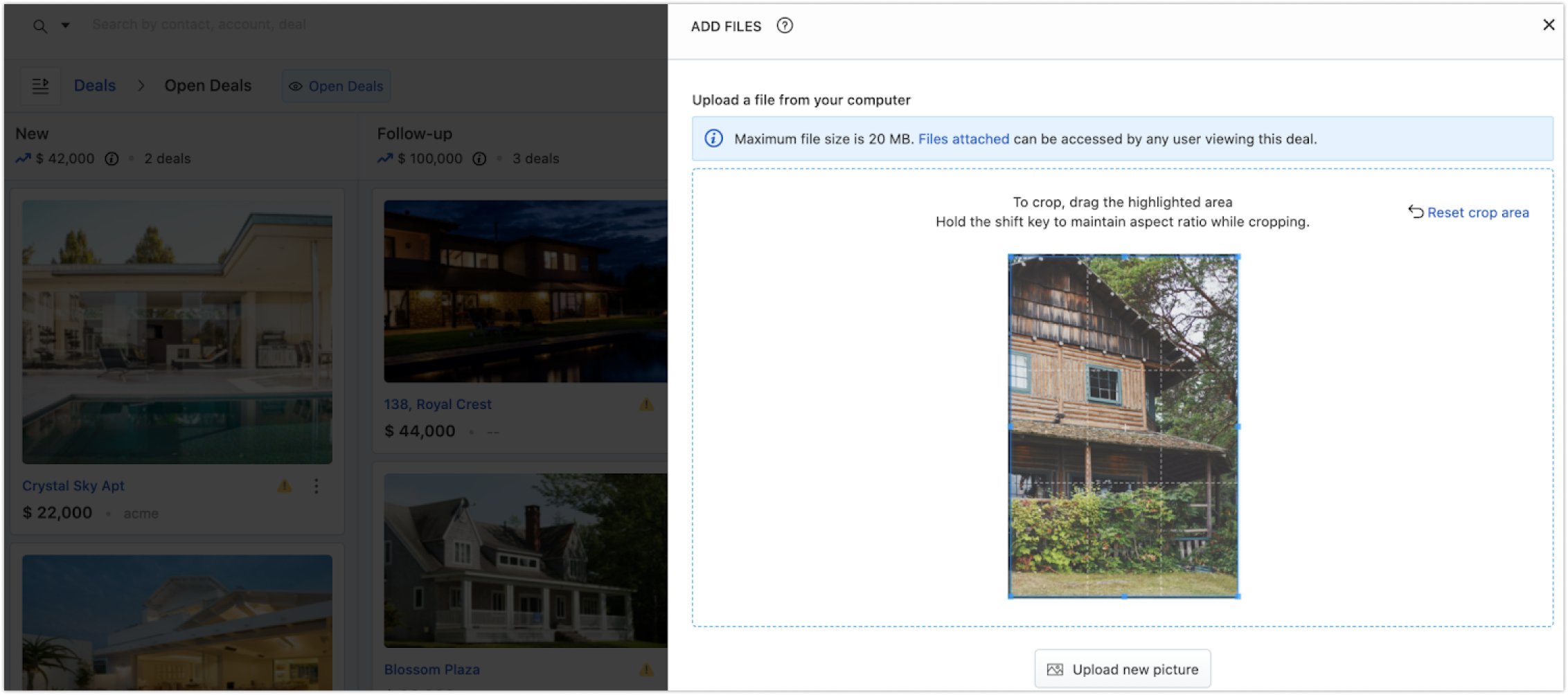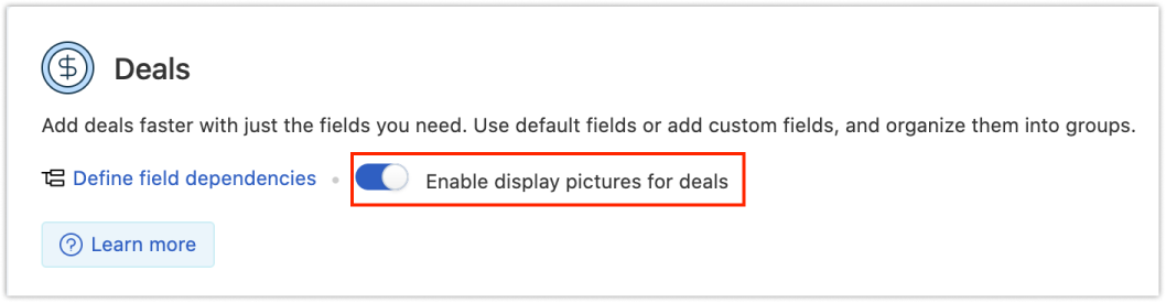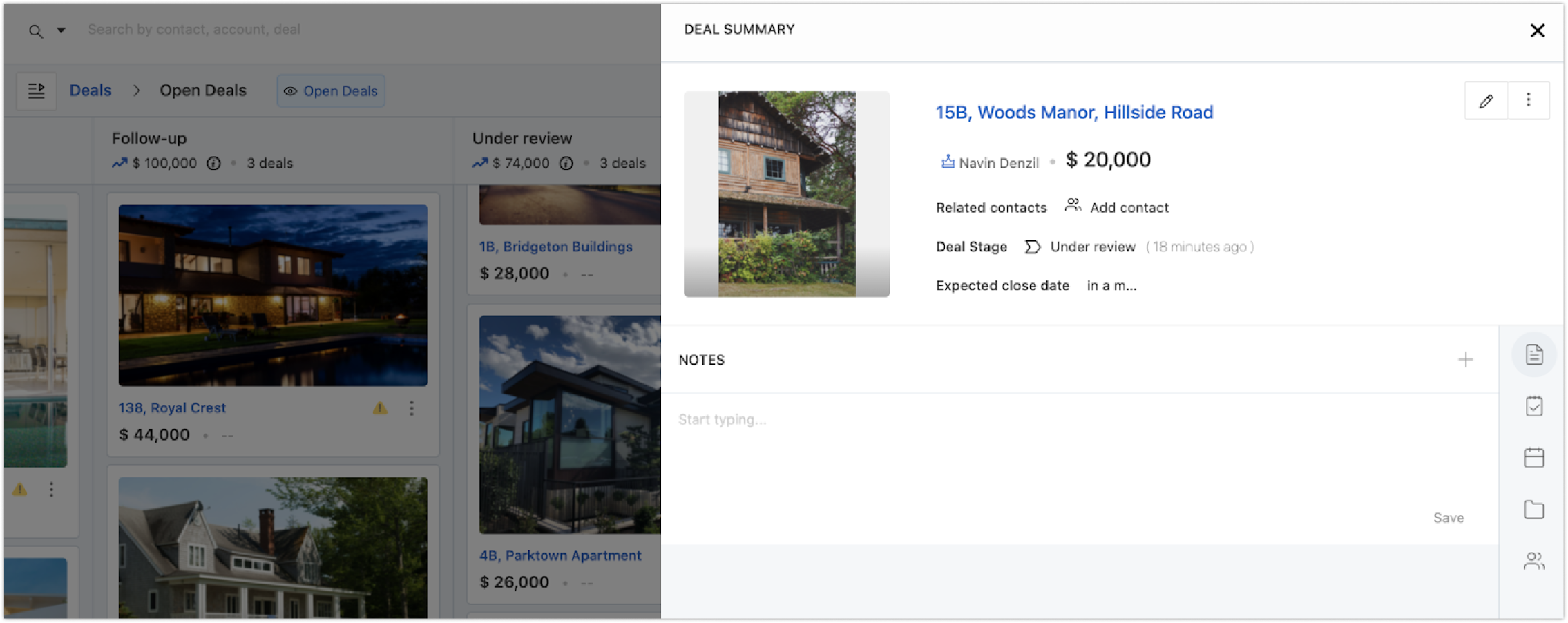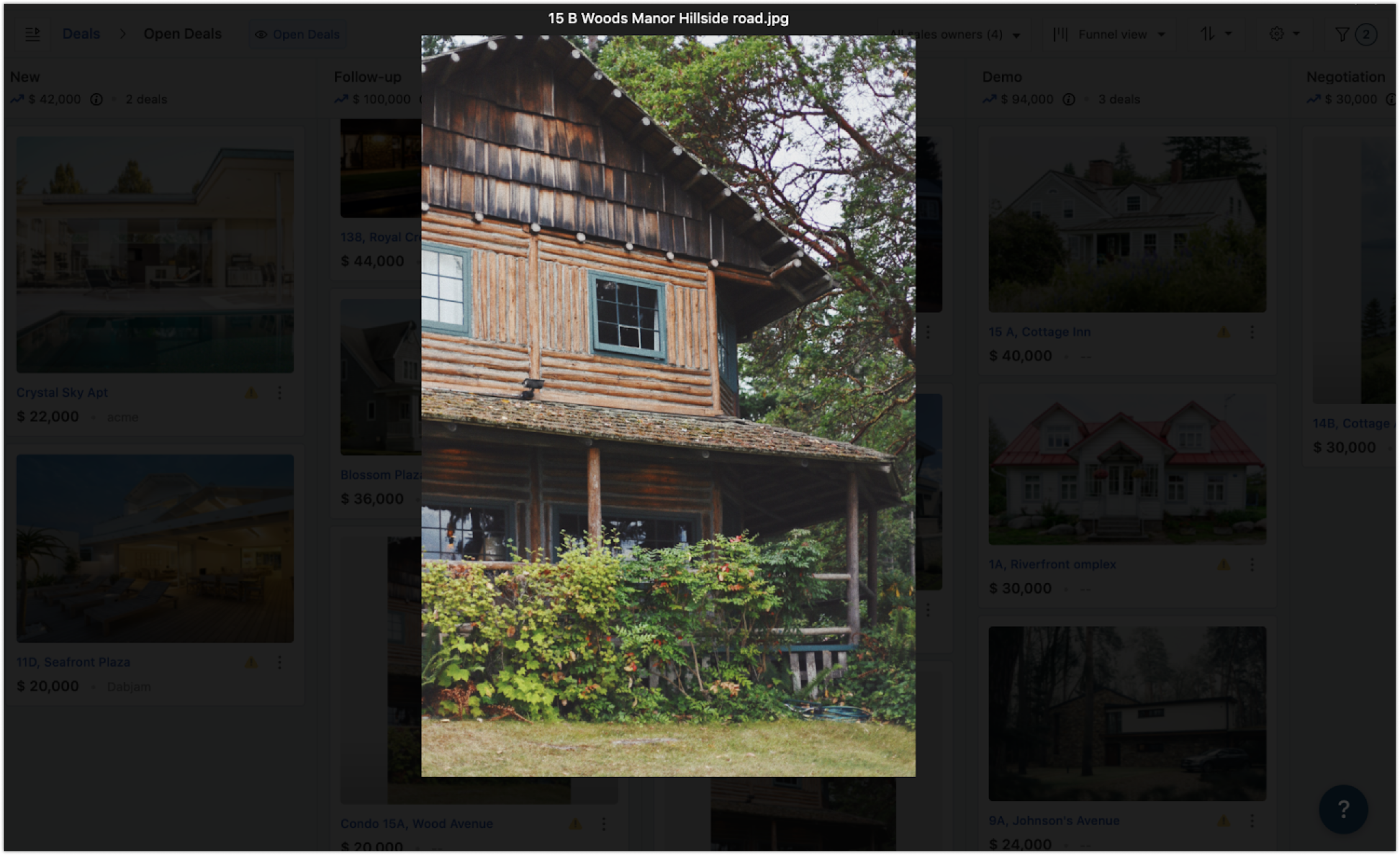 Observação: quando esta opção estiver desativada, os usuários perderão o acesso para adicionar imagens de exibição aos negócios. Para adicionar imagens de exibição a um negócio, 1. Vá para o módulo Ofertas e escolha qualquer transação. 2. Clique no negócio. Isso abre a sobreposição DEAL SUMMARY .