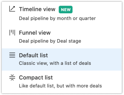 Visualize seus negócios abertos usando a exibição de negócios abertos , que está disponível nas exibições de funil, lista e linha do tempo.