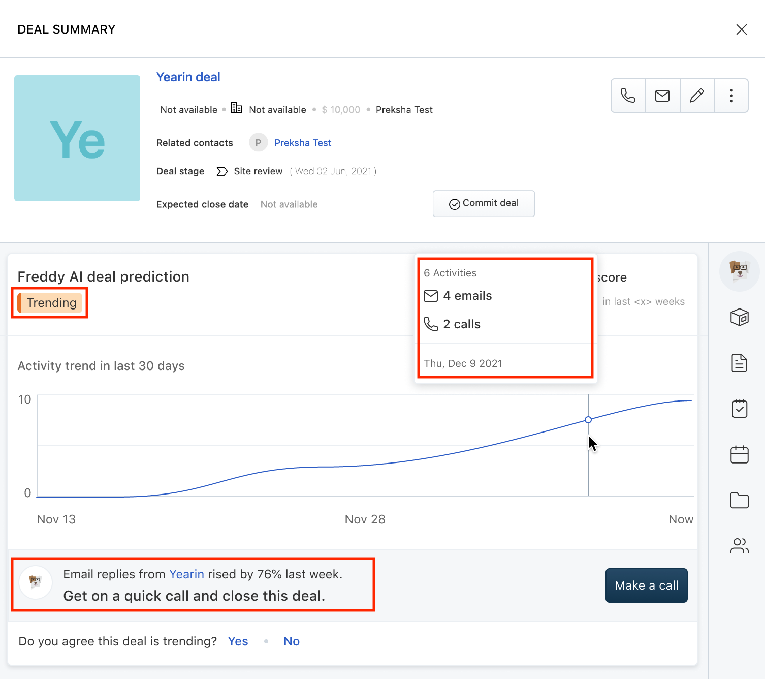 Observação: o Freddy Deal Insights funciona com base em um modelo de ML. O modelo é atualizado uma vez a cada 30 minutos.