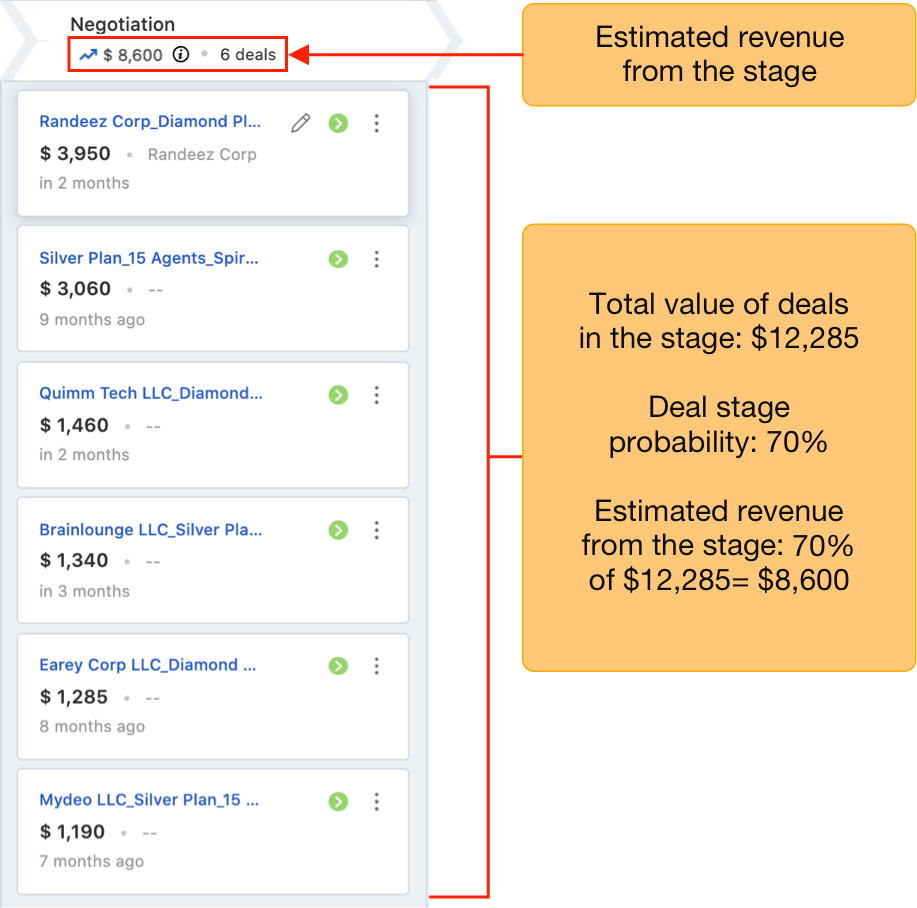 Em qualquer estágio do negócio, apenas uma fração dos negócios é convertida com sucesso. Considerando essa probabilidade para cada estágio do negócio, a receita de estágios individuais pode ser estimada de forma realista.