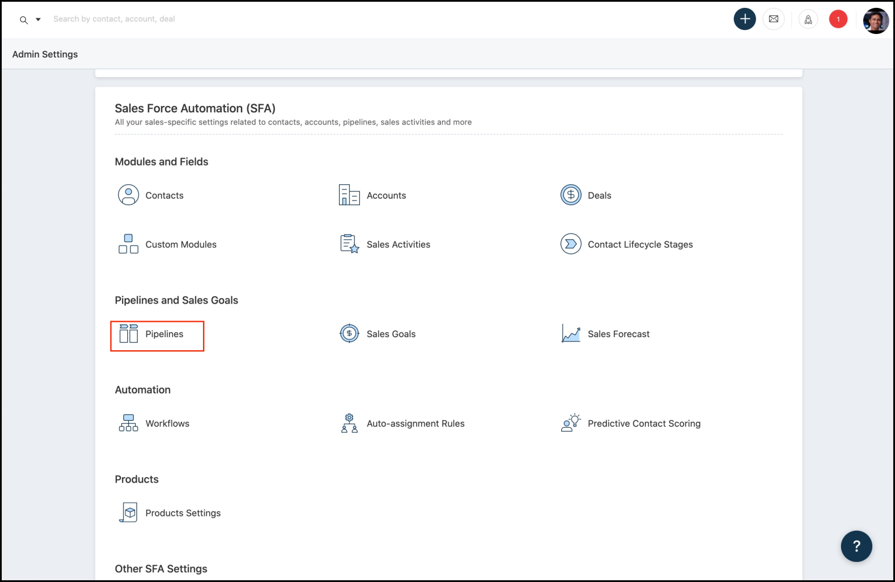 Depois de excluir seu pipeline, os negócios do pipeline excluído são movidos para o primeiro estágio do pipeline padrão do administrador.