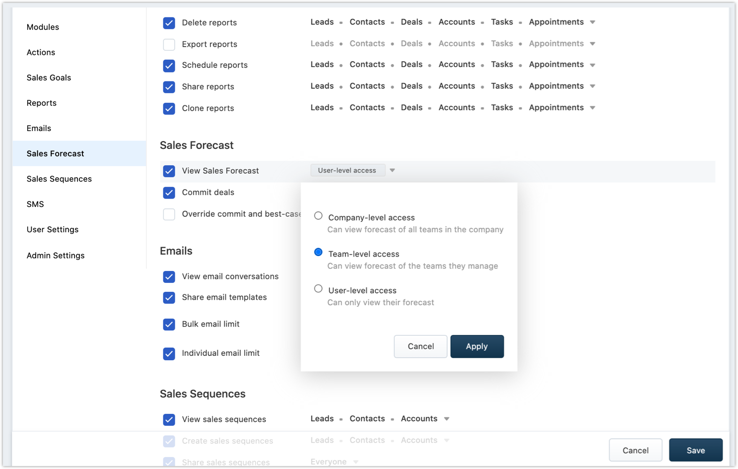 A funcionalidade para confirmar negócios e substituir os valores de confirmação e melhor caso é regida pelas Funções e Permissões. Para configurar as permissões, vá para Admin Settings > Roles > e role para baixo até a seção Sales Forecast. Clique na caixa de seleção para conceder as permissões necessárias para uma função.