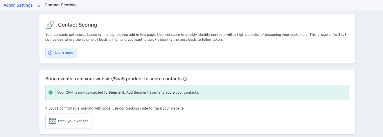 1. Na página Configurações de administrador>Pontuação de contato. Aqui você pode optar por Integrar com Segmento.