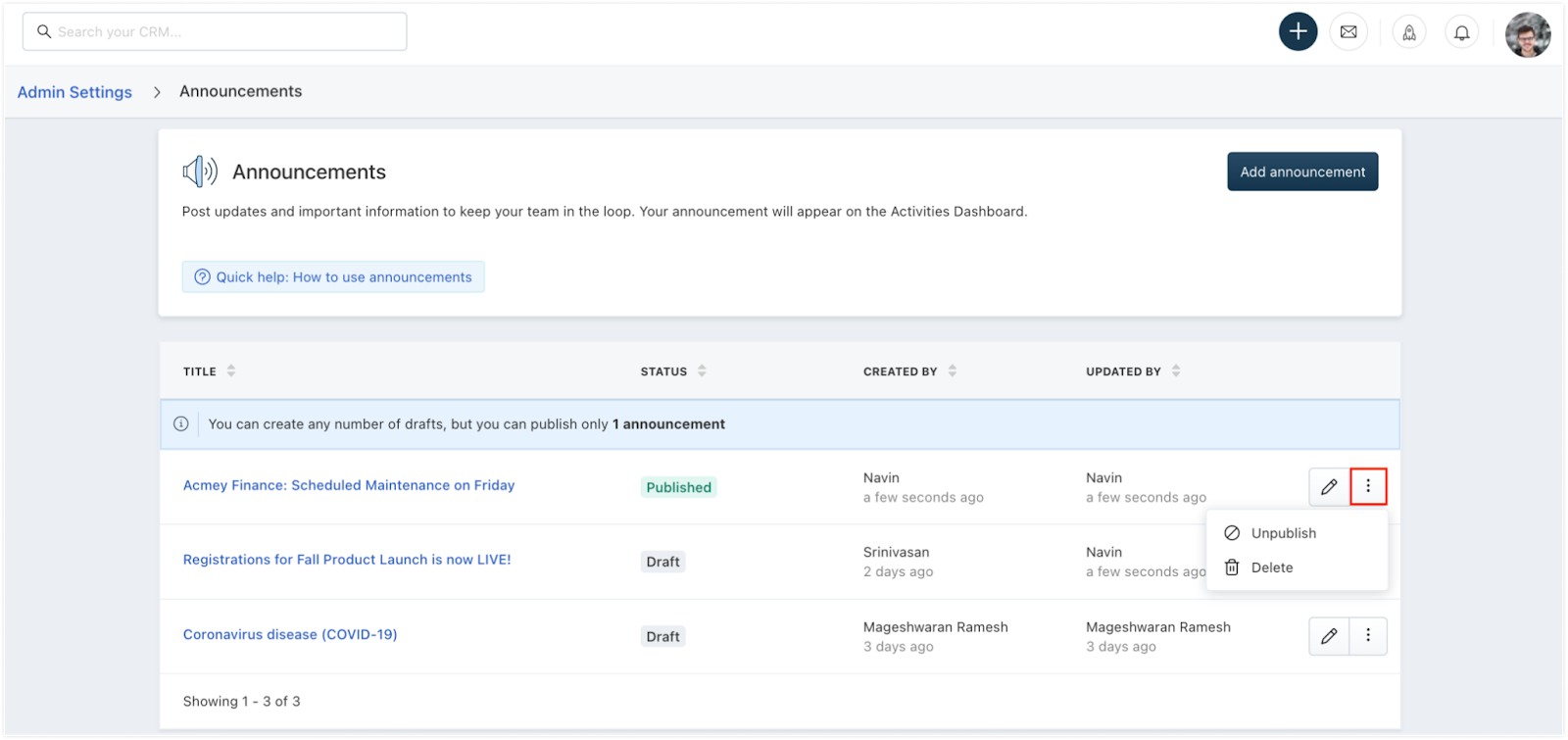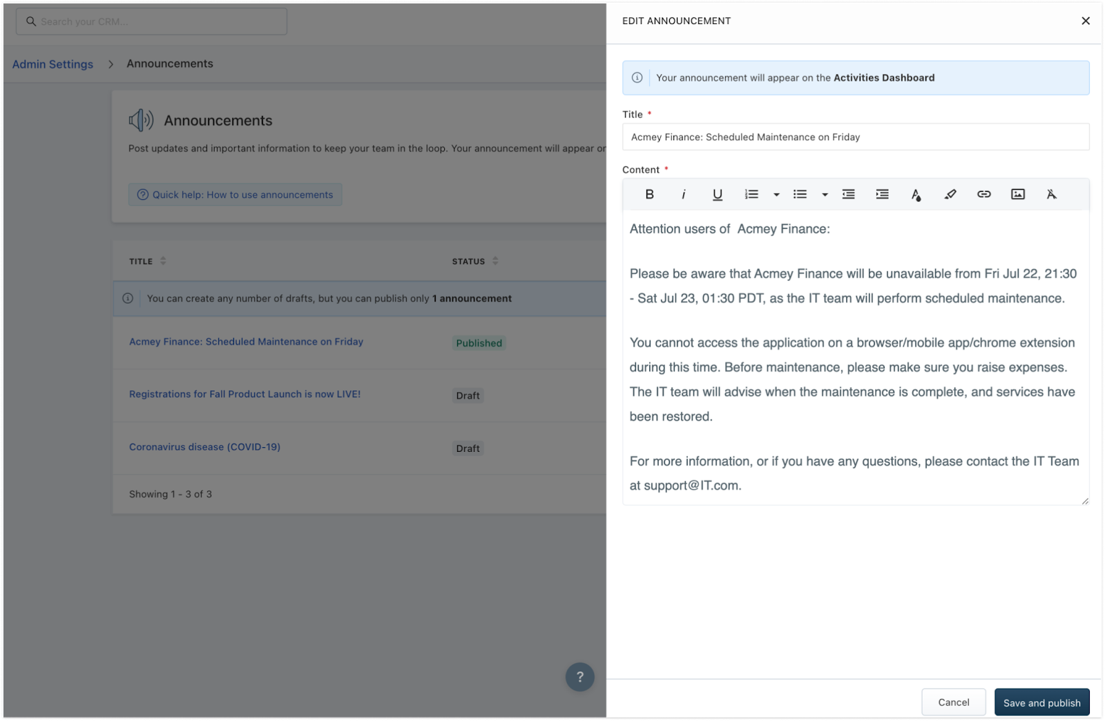 Os administradores podem criar, editar e publicar anúncios internos, como notícias da organização, atualizações, etc., para usuários no aplicativo da web.