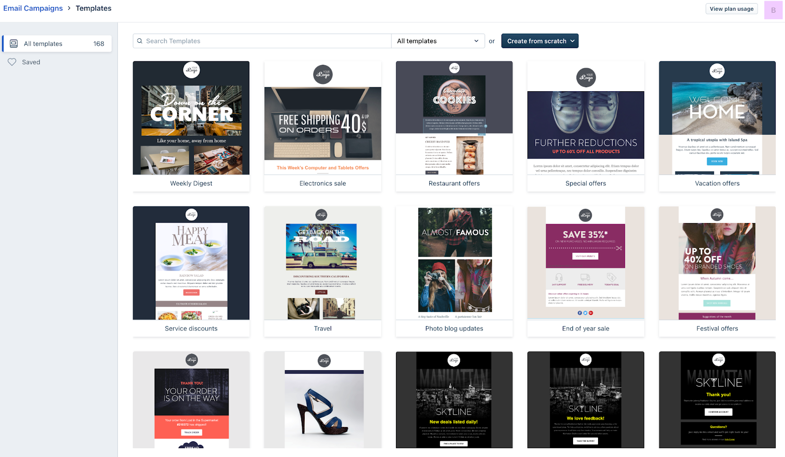 1. Para criar uma campanha de e-mail, escolha entre modelos pré-construídos ou crie o seu próprio do zero.