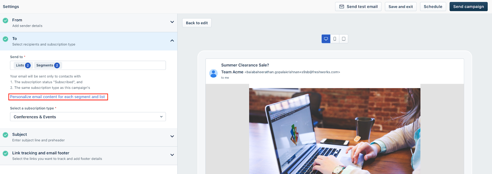 Personalize seu modelo de e-mail: Você pode personalizar seus modelos de e-mail na etapa Design usando o botão "Personalizar" no canto superior direito. Você pode alternar entre diferentes segmentos para fazer as alterações necessárias para cada um dos modelos correspondentes. Ele ajuda você a enviar conteúdo de e-mail diferente para vários segmentos dentro de sua lista. Ajuda na análise de qual modelo tem melhor engajamento.