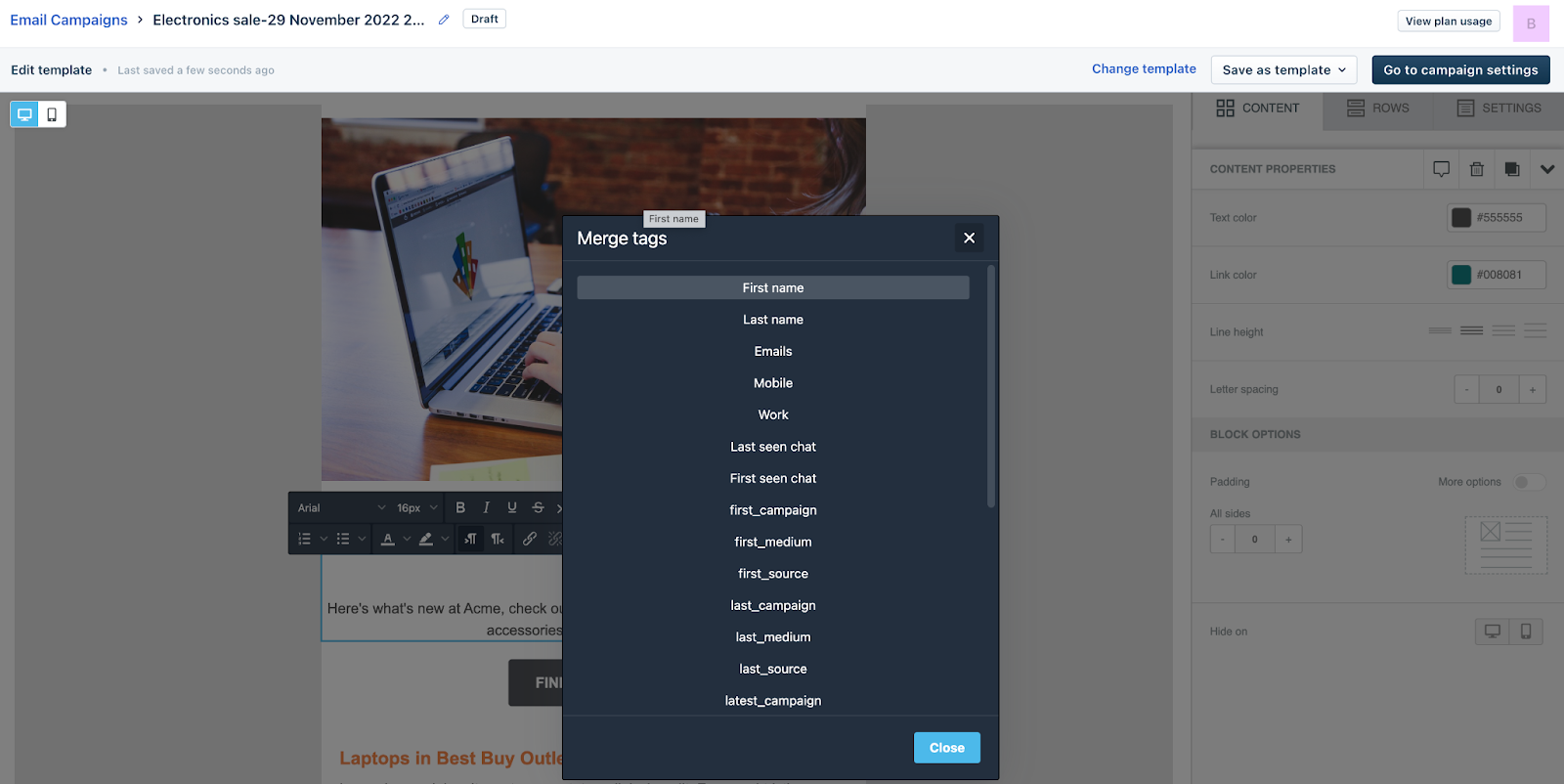 2. Na próxima tela, você pode começar a criar seu e-mail usando os widgets de arrastar e soltar. Adicione contexto ao e-mail com o widget de texto. Use etiquetas de mesclagem para personalizar o conteúdo de seu e-mail para cada contato. Os espaços reservados serão preenchidos dinamicamente pelos valores da propriedade de contato durante a entrega do e-mail. Por exemplo, ao selecionar o Nome, o nome do usuário será incluído no e-mail durante o envio.