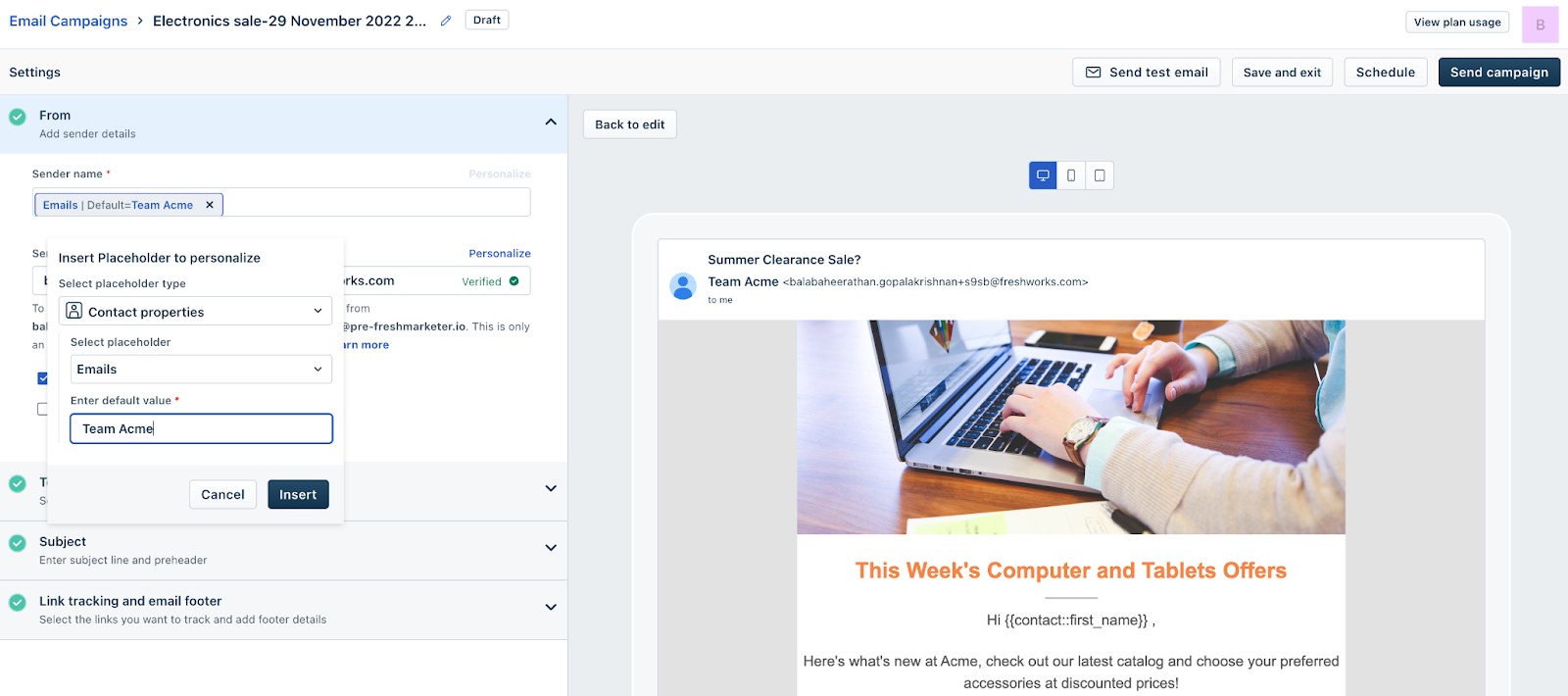 3. Uma vez desenhada a campanha, você pode definir as configurações da campanha. Nesta tela, você pode configurar o remetente e o endereço de e-mail de resposta. Você pode optar por personalizar o nome do remetente e também configurar um valor alternativo.