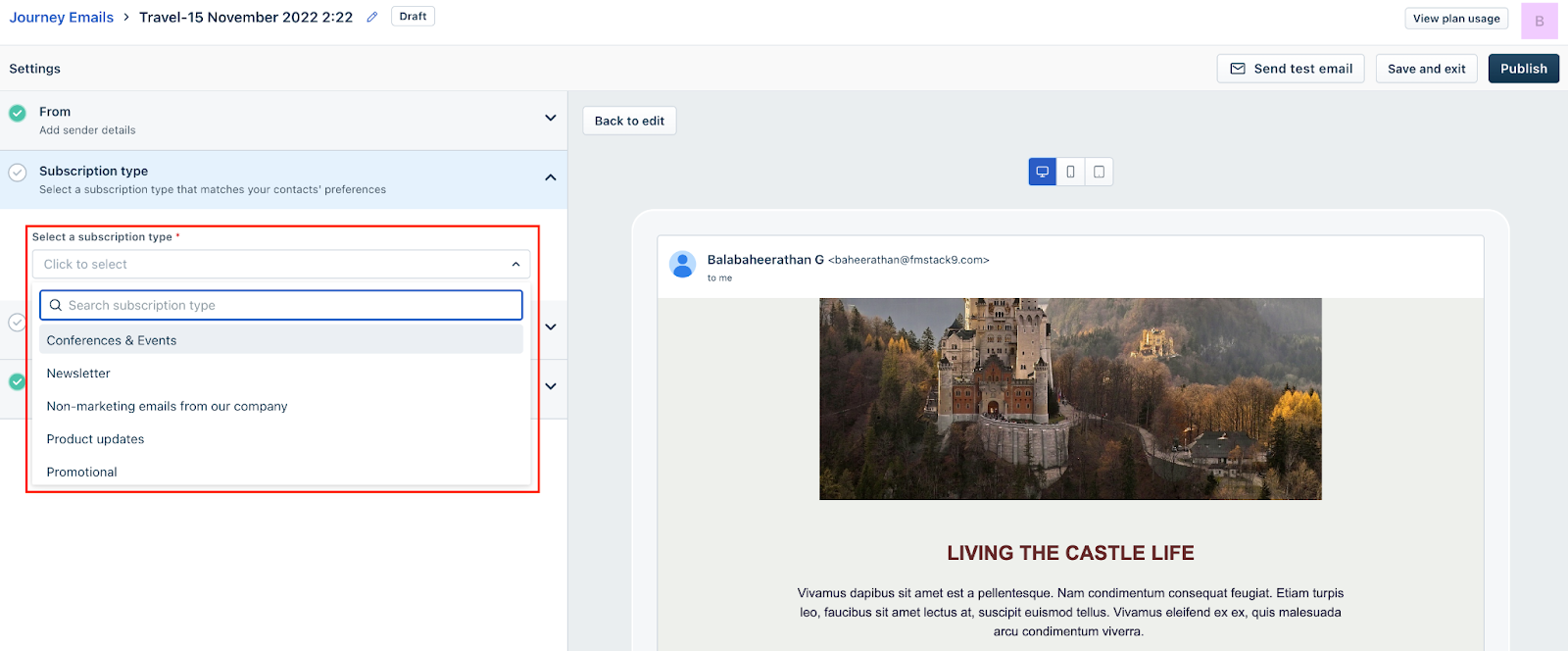 Acesse os e-mails do Journey e crie seu e-mail a partir de modelos pré-construídos ou do zero. Crie seu e-mail e vá até a guia Configurações da campanha para selecionar o tipo de e-mail de assinatura.