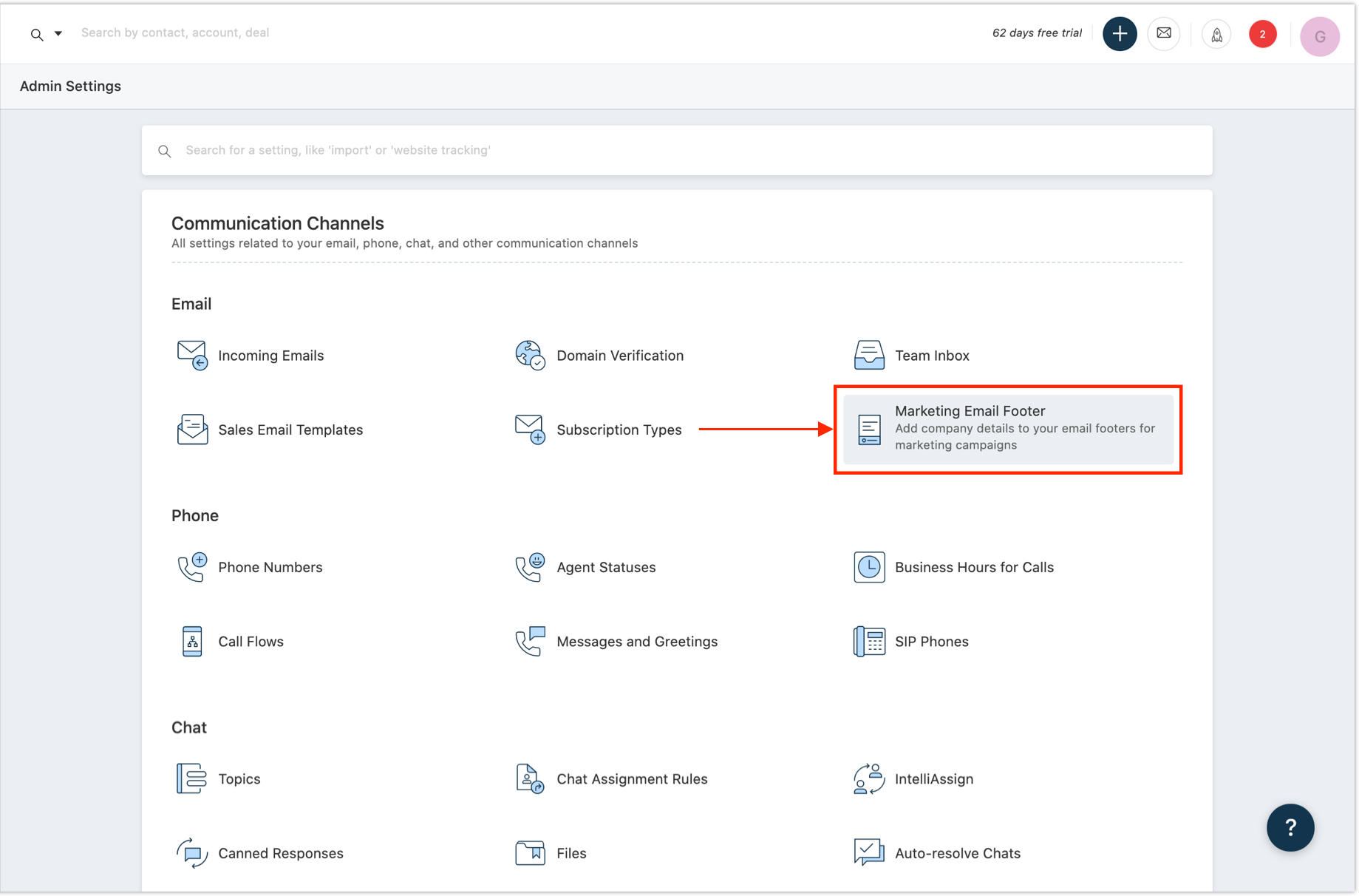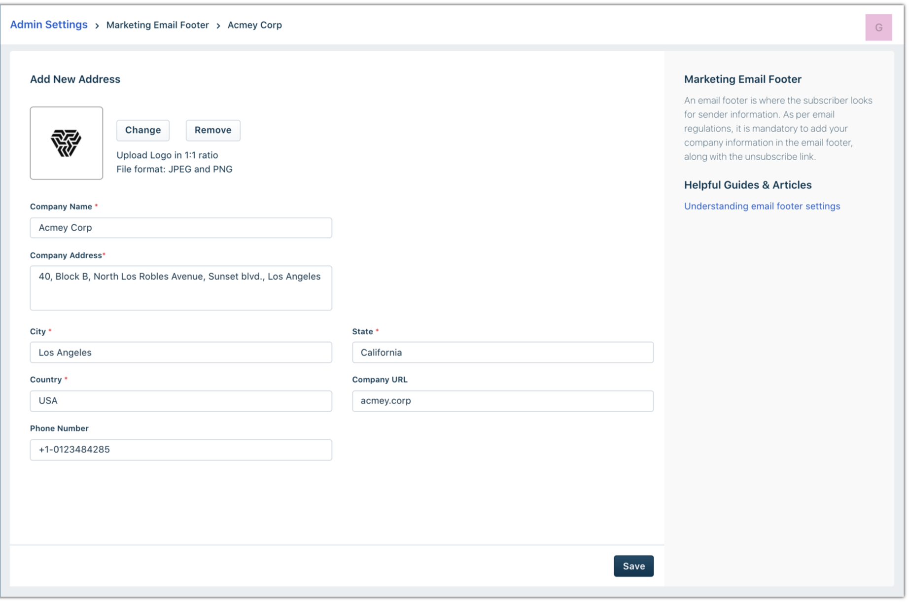 Vá para Configurações de administrador > Rodapés de e-mail de marketing e clique no mesmo. Isso abre a página onde você pode configurar os detalhes do rodapé da sua empresa.