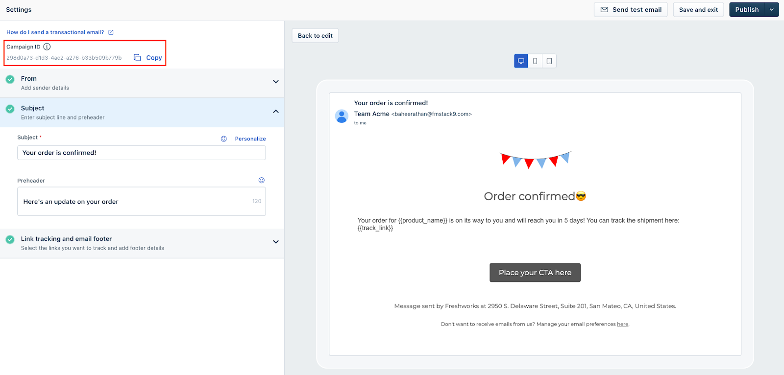 4. Na próxima etapa, defina as configurações da campanha, incluindo remetente e endereço de e-mail de resposta, linha de assunto e público. Revise seu conteúdo, anote o ID da campanha e publique sua campanha.