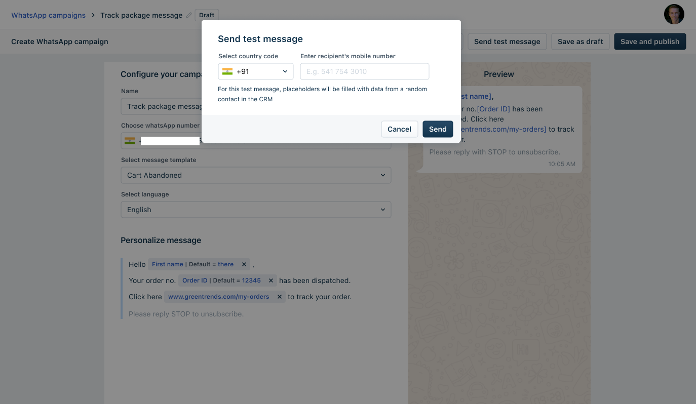 - Em seguida, configure sua campanha com os detalhes necessários. Selecione seu número de WhatsApp, o modelo de mensagem adequado e o idioma para o qual pretende enviar a mensagem.