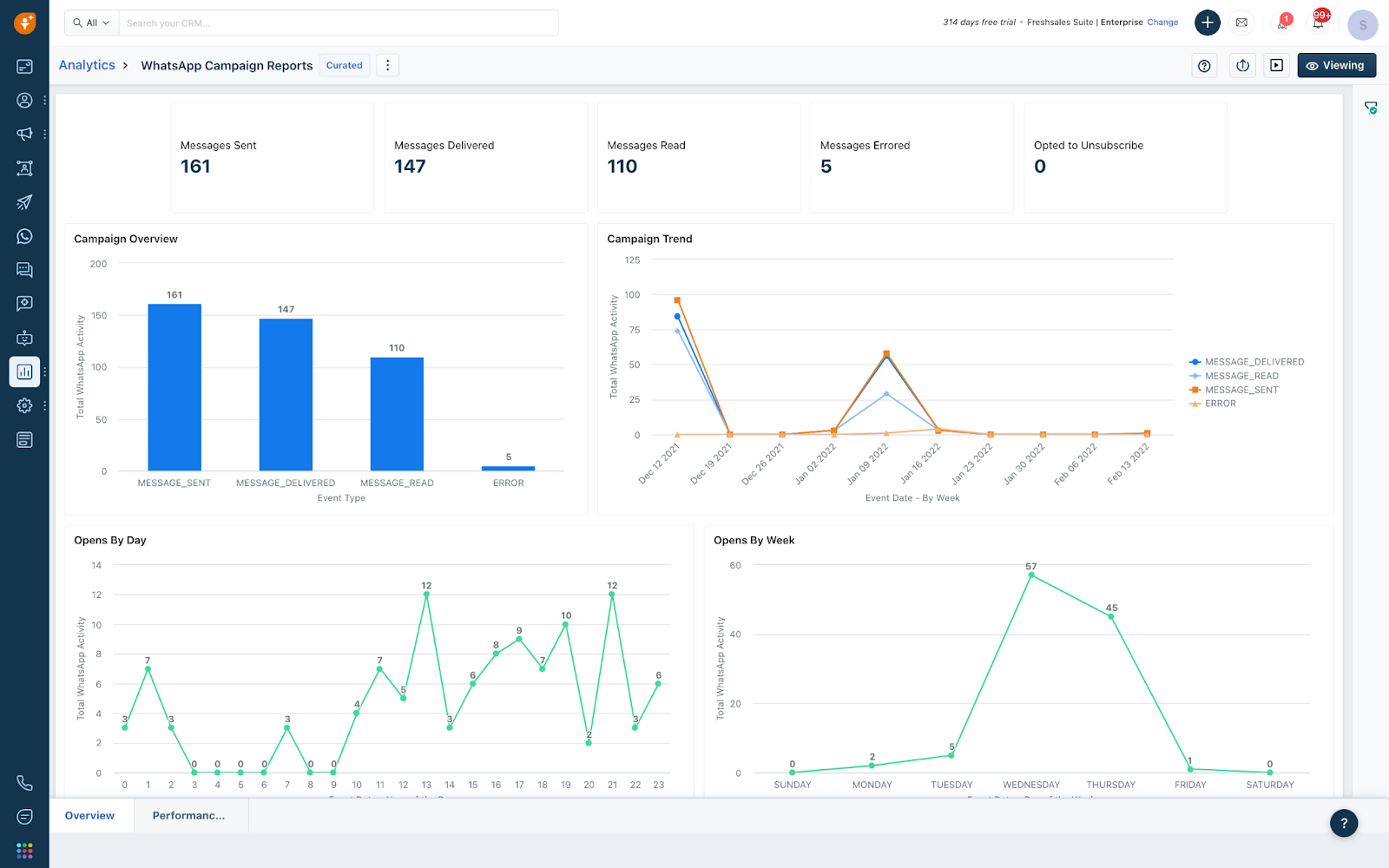 Da mesma forma, o CRM também oferece análises para campanhas do WhatsApp. Obtenha informações sobre as principais métricas, como aberturas e leituras, por meio do painel selecionado criado para campanhas do WhatsApp.